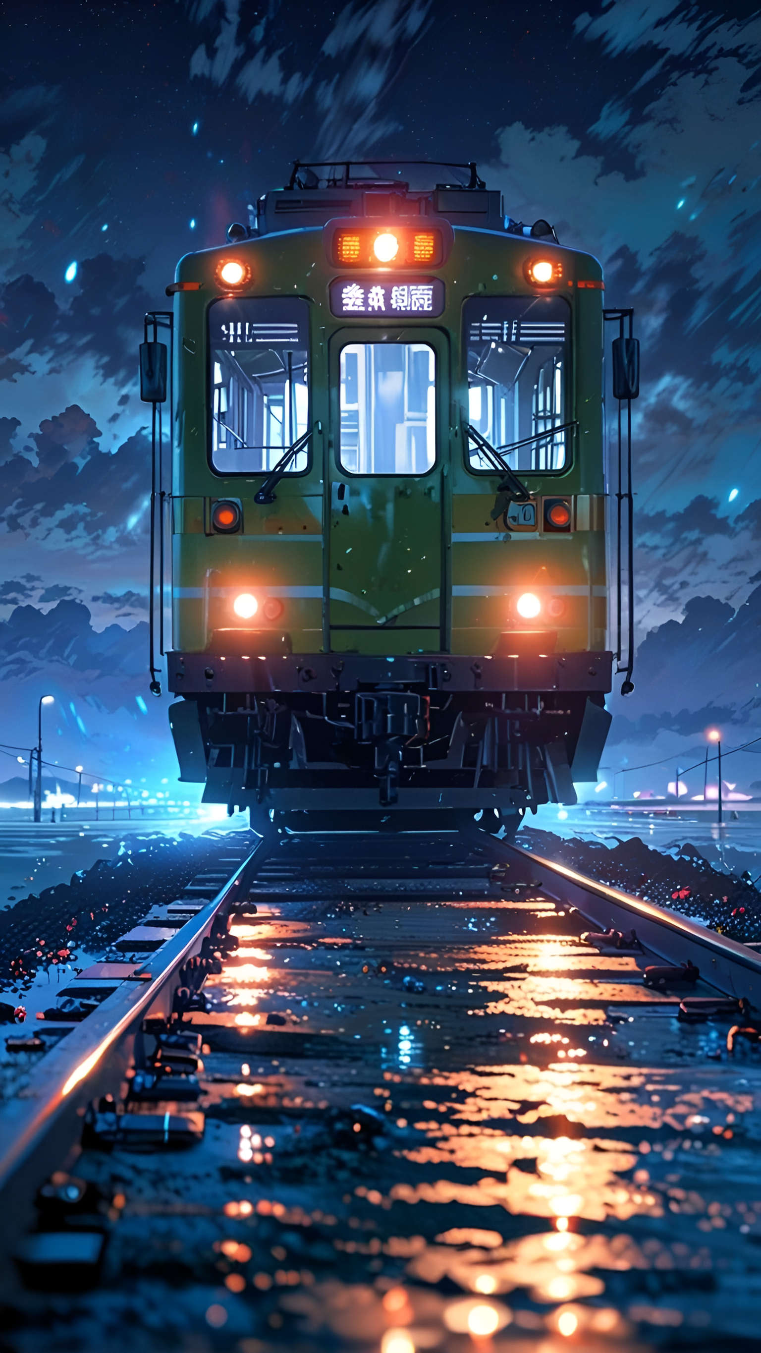 Experience the allure of urban travel with this captivating wallpaper featuring a vibrant green train illuminated against a starry night sky. The reflections on the wet tracks and the glowing lights create a mesmerizing atmosphere, perfect for fans of anime and cityscapes.