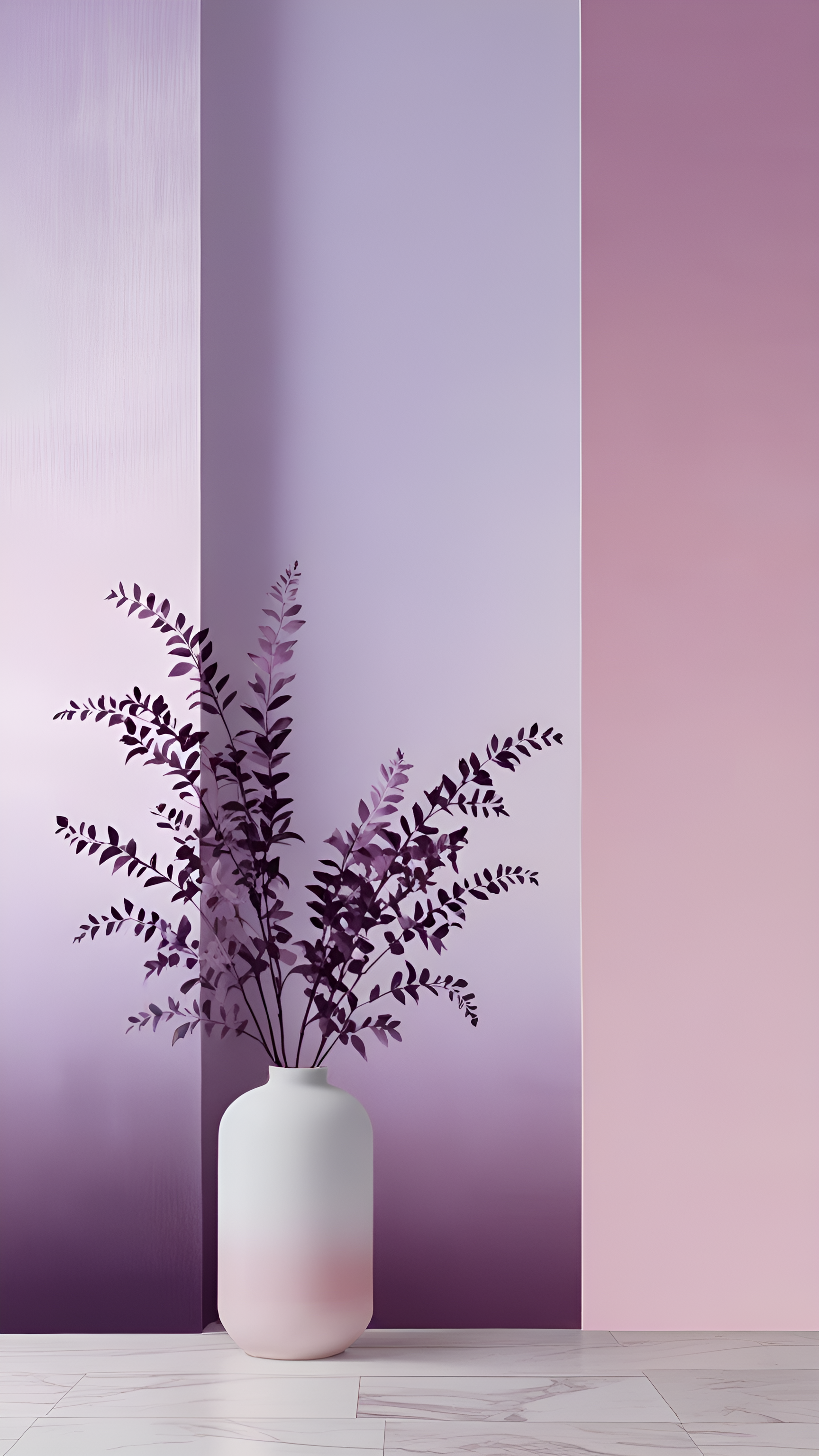 Enhance your space with this stunning wallpaper featuring a sophisticated ombre design in shades of purple and pink. The elegant white vase filled with delicate foliage adds a touch of nature and tranquility, making it perfect for creating a calming atmosphere in any room.