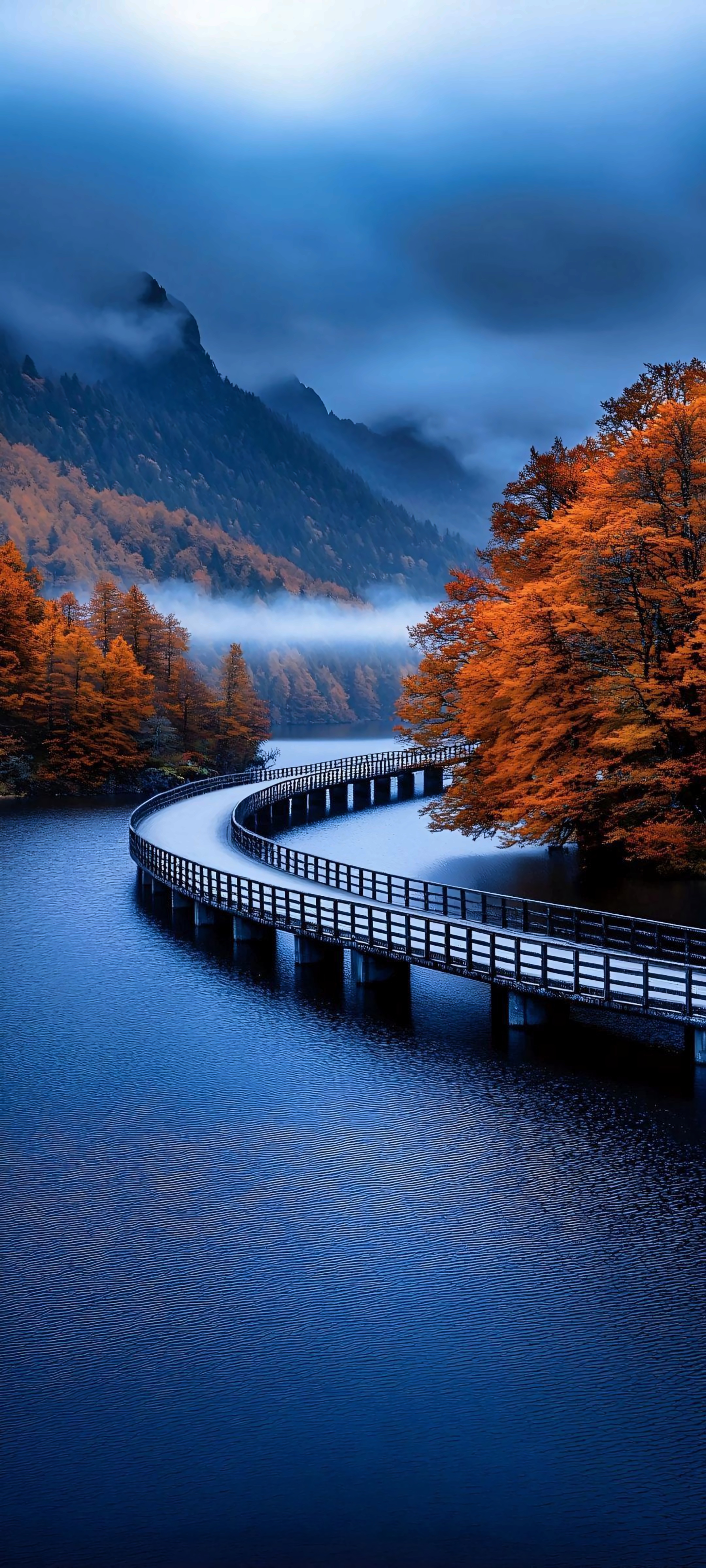 Introducing 'Autumn Serenity: The Winding Path,' a breathtaking wallpaper that captures the tranquility of nature in an autumn setting. This artwork features a beautifully curved wooden bridge that gracefully stretches over a calm body of water, surrounded by vibrant orange foliage and misty mountains. The contrast between the deep blues of the water and the fiery oranges of the trees creates a stunning visual harmony. The serene atmosphere invites viewers to imagine a peaceful journey through this picturesque landscape, making it an ideal backdrop for those seeking calm and inspiration in their digital space.