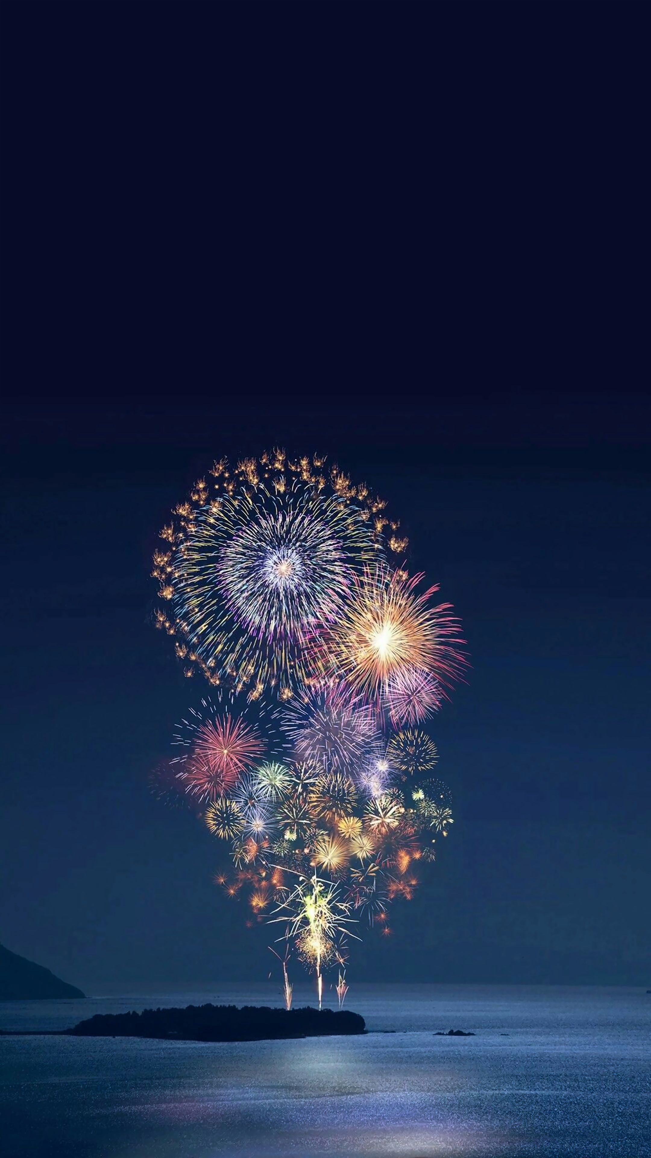 Presenting 'Celestial Celebration: Fireworks Over the Ocean,' a stunning wallpaper that captures the magic of a nighttime fireworks display. Set against a tranquil sea, this artwork features an array of colorful fireworks bursting in the sky, illuminating the dark blue canvas with vibrant hues of red, gold, purple, and green. The reflection of the fireworks dances on the water's surface, creating a mesmerizing spectacle that evokes feelings of joy and celebration. Perfect for festive occasions or as a lively backdrop for your digital space, this wallpaper invites viewers to experience the beauty and excitement of a night filled with wonder.