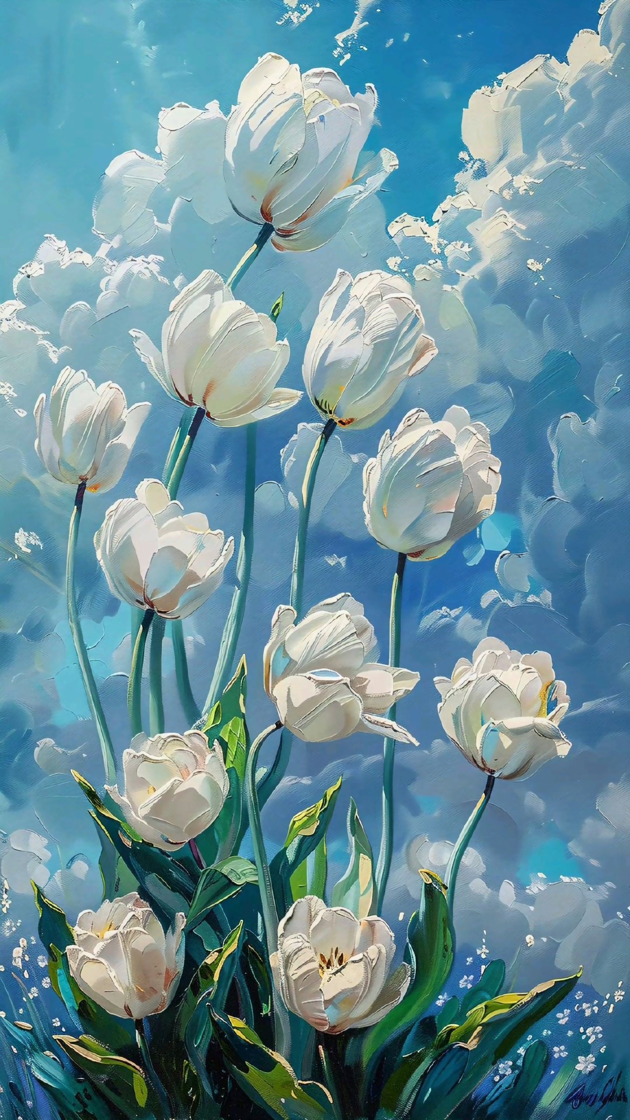 Introducing 'Ethereal Blooms: The Dance of Tulips,' a stunning wallpaper that captures the serene beauty of nature. This artwork features elegant white tulips gracefully rising towards a vibrant blue sky, surrounded by soft clouds that add a dreamy quality to the scene. The delicate petals and lush green leaves are rendered with exquisite detail, evoking a sense of tranquility and renewal. Perfect for nature lovers and those looking to bring a touch of elegance to their space, this wallpaper invites viewers to appreciate the simple yet profound beauty of floral life.