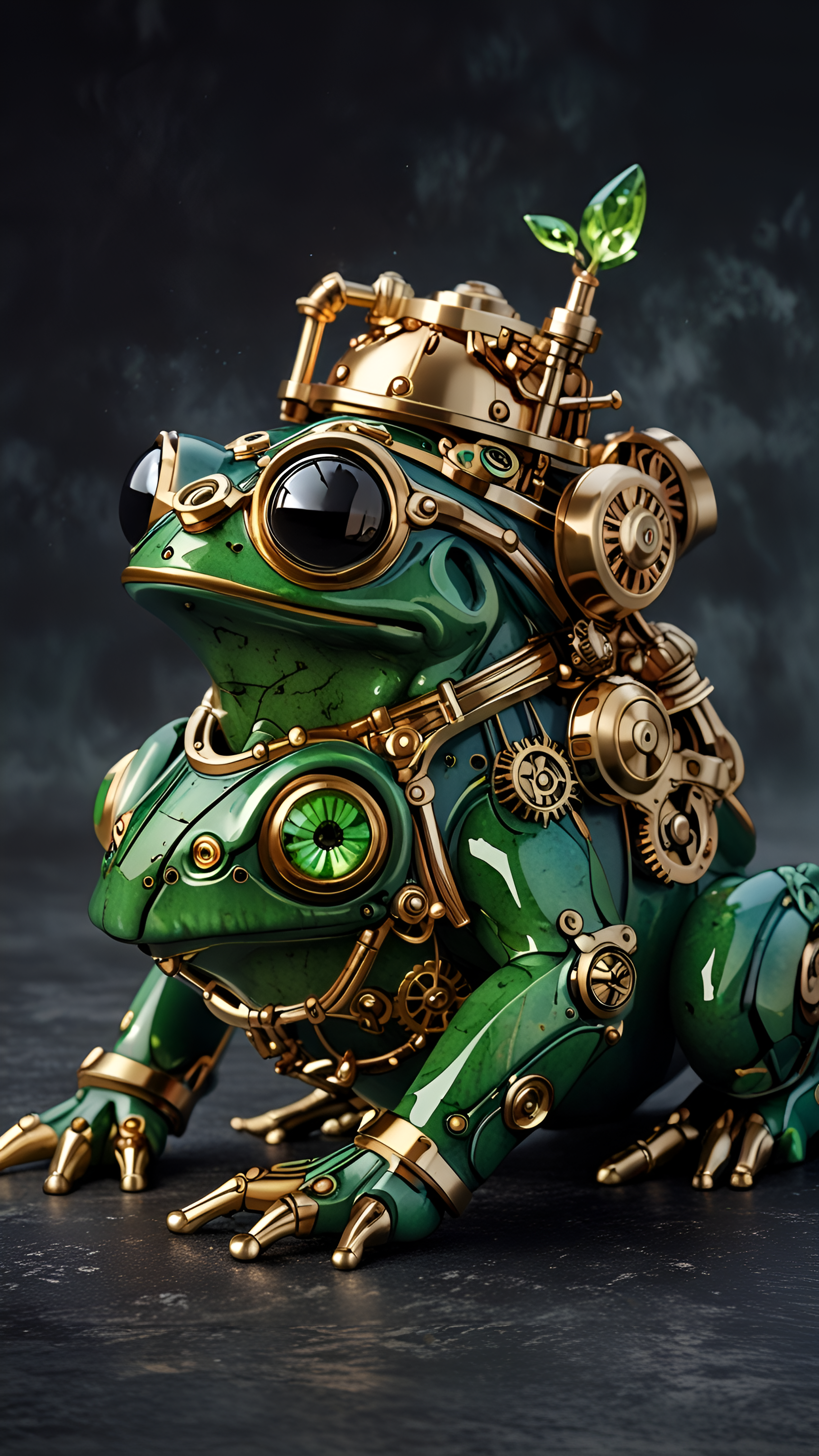 Introducing 'Mechanical Frog: Guardian of Nature,' a whimsical yet striking piece that blends nature with steampunk aesthetics. This unique artwork features a beautifully crafted robotic frog adorned with intricate golden gears and emerald-green accents. The frog's design showcases a fusion of organic and mechanical elements, with large, expressive eyes and a delicate green leaf sprouting from its back, symbolizing the harmony between technology and nature. Set against a dark, textured background, this piece captures the imagination and invites viewers to explore a world where nature and innovation coexist. Ideal for fans of fantasy art and steampunk themes.