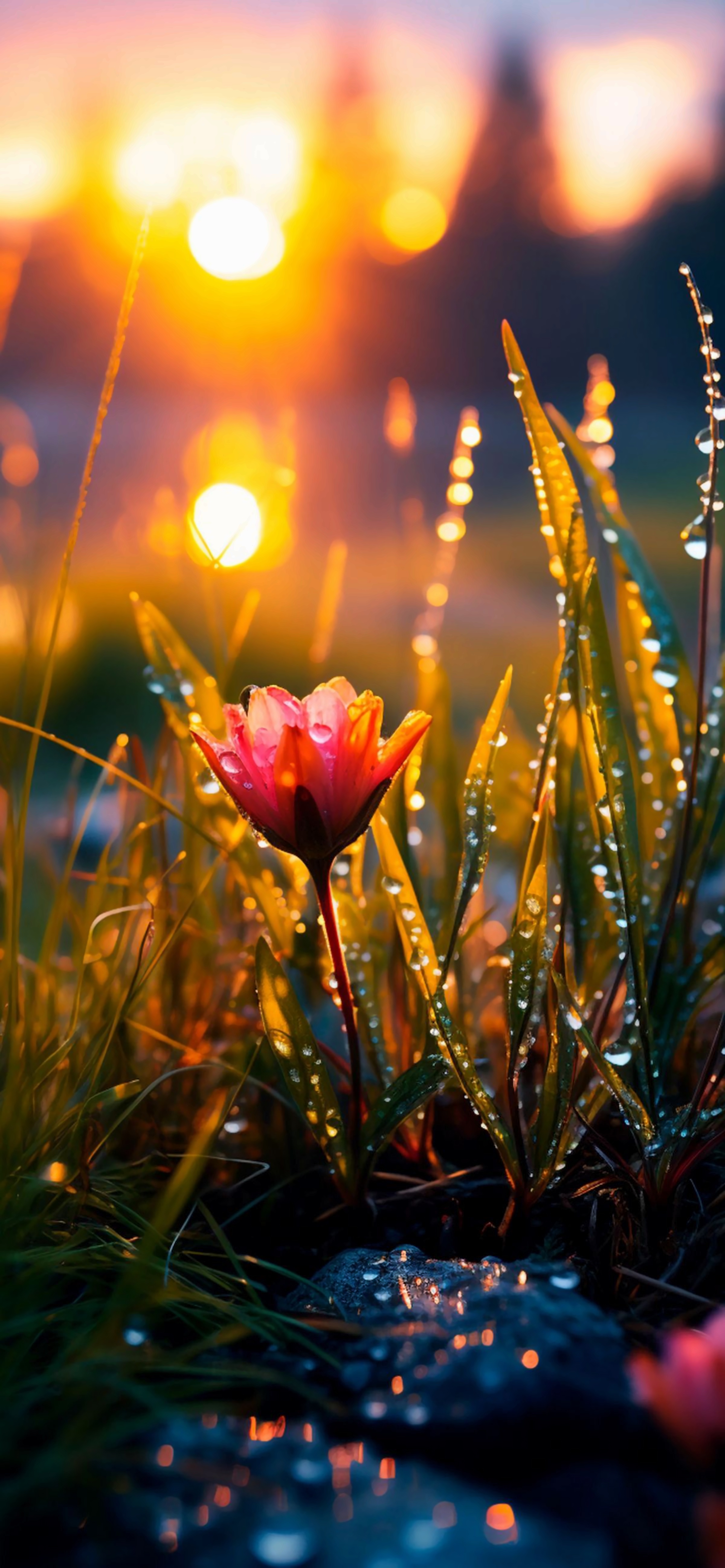 Introducing 'Sunset Blossom: Nature's Embrace,' a breathtaking piece that captures the serene beauty of a blooming flower at sunset. The artwork features a radiant pink flower glistening with dew droplets, surrounded by lush green grass. The warm hues of the setting sun create a magical backdrop, casting a golden glow that enhances the delicate petals and the vibrant colors of nature. This piece evokes feelings of tranquility and connection to the natural world, making it perfect for nature lovers and those seeking a moment of peace. Ideal for home decor or as a reminder of nature's beauty.