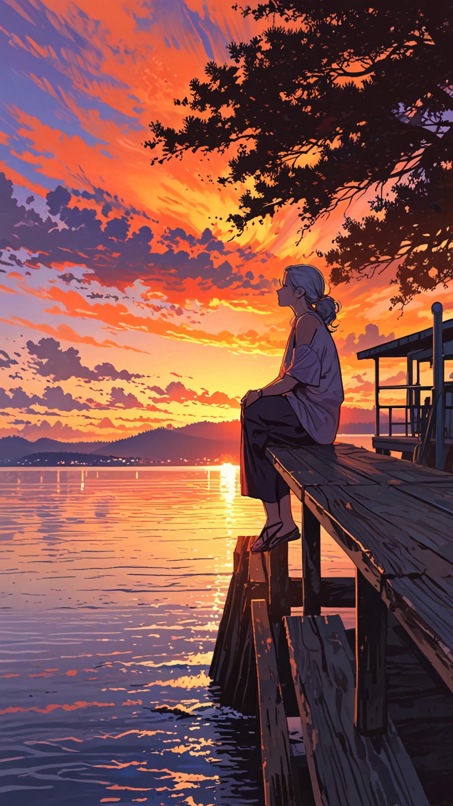 Introducing 'Whispers of Sunset: A Moment of Reflection,' a captivating artwork that beautifully captures the tranquility of a sunset by the water. The scene features a contemplative figure sitting on a wooden dock, gazing at the vibrant colors of the sky as the sun sets over the horizon. Rich shades of orange, pink, and purple blend seamlessly, creating a stunning backdrop that reflects on the calm water. This artwork evokes feelings of peace, introspection, and connection to nature, making it perfect for anyone seeking to bring a touch of serenity into their space. Ideal for home decor or as a reminder of the beauty of quiet moments.