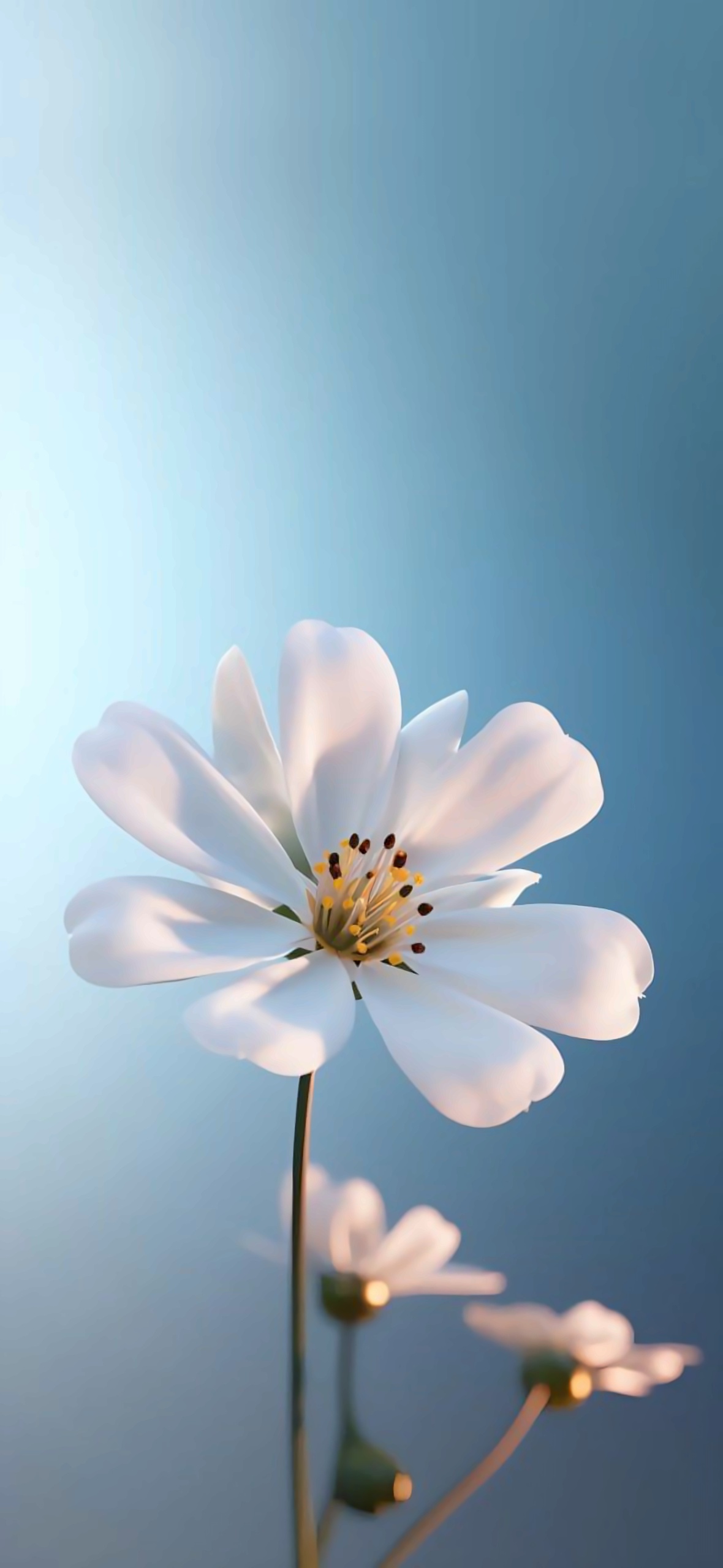 Introducing 'Elegance in Bloom: The White Blossom,' a serene wallpaper that captures the delicate beauty of nature. This artwork showcases a single white flower with soft petals and intricate details, standing gracefully against a soothing blue gradient background. The gentle light enhances the flower's features, creating a tranquil and calming atmosphere. Perfect for those who appreciate minimalist designs and the subtle elegance of floral art, this image invites viewers to find peace and inspiration in nature's simplicity.