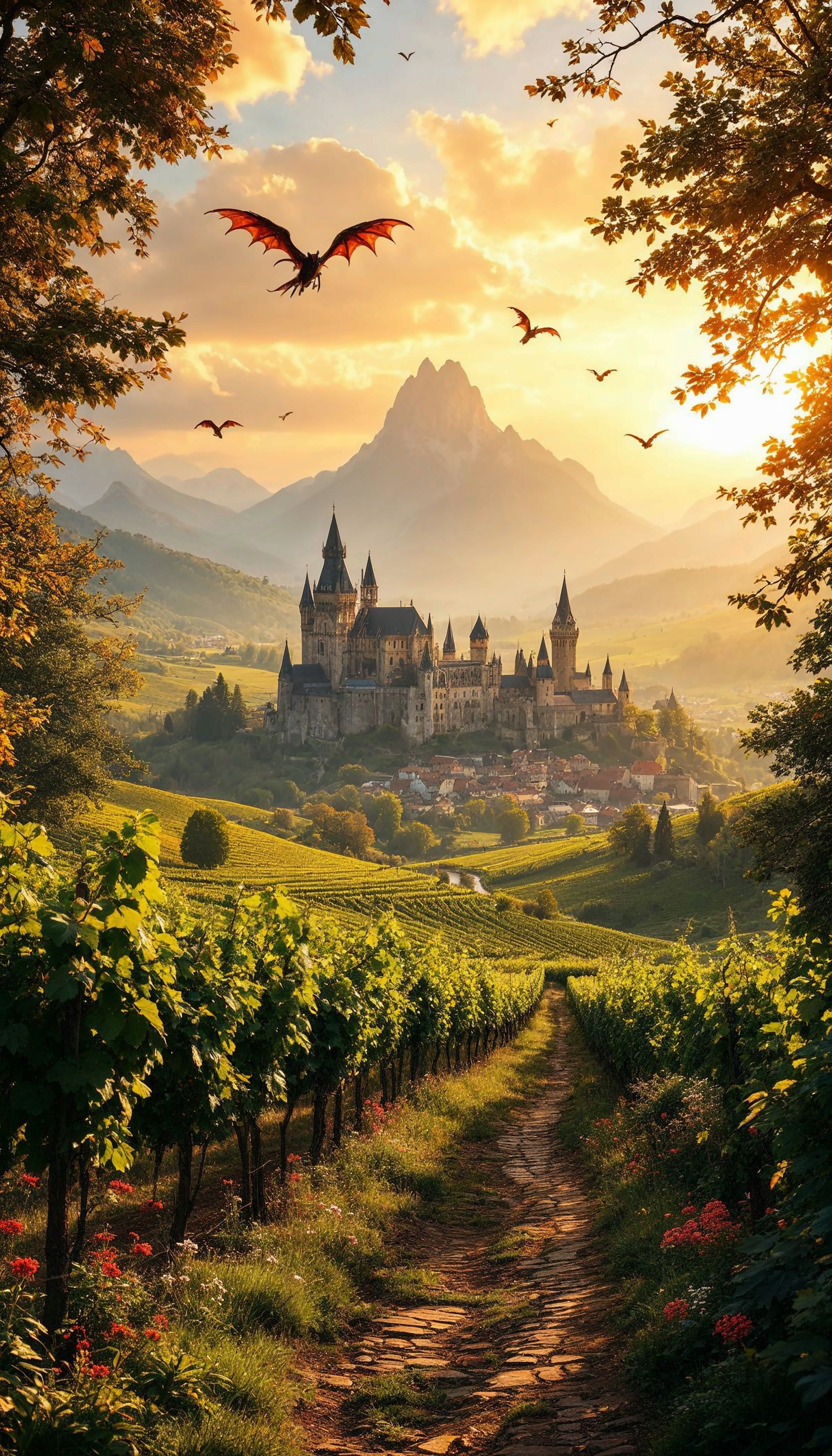 Introducing 'Enchanted Kingdom: The Castle of Dreams,' a breathtaking landscape that transports viewers to a fairy-tale realm. This stunning artwork features a magnificent castle nestled among lush vineyards, bathed in the warm glow of a golden sunset. Majestic mountains rise in the background, while vibrant dragons soar through the sky, adding an element of fantasy and adventure. The winding path through the vineyard invites exploration and discovery, making this piece perfect for lovers of fantasy, nature, and medieval aesthetics. Experience the magic and wonder of this enchanting scene.