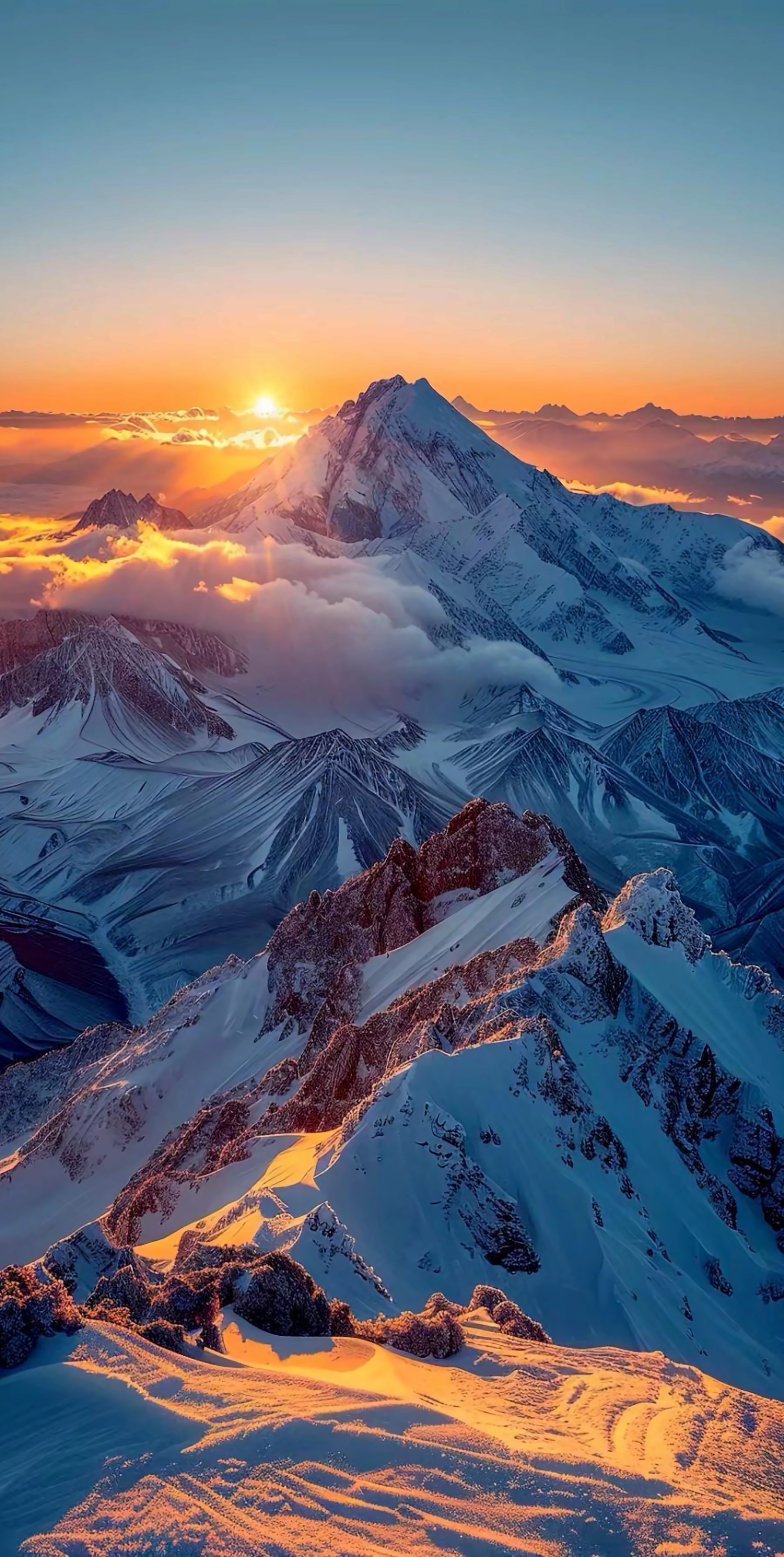 Introducing 'Mountain Serenity: Dawn of a New Day,' a captivating landscape that showcases the majestic beauty of snow-capped mountains illuminated by the warm glow of sunrise. The scene captures the intricate details of the rugged terrain, with sweeping valleys and towering peaks rising above a sea of clouds. The vibrant colors of the sunrise blend seamlessly with the cool blues and whites of the snow, creating a harmonious balance between warmth and tranquility. This artwork serves as a perfect reminder of nature's breathtaking beauty, ideal for those who appreciate the serenity and grandeur of mountainous landscapes.