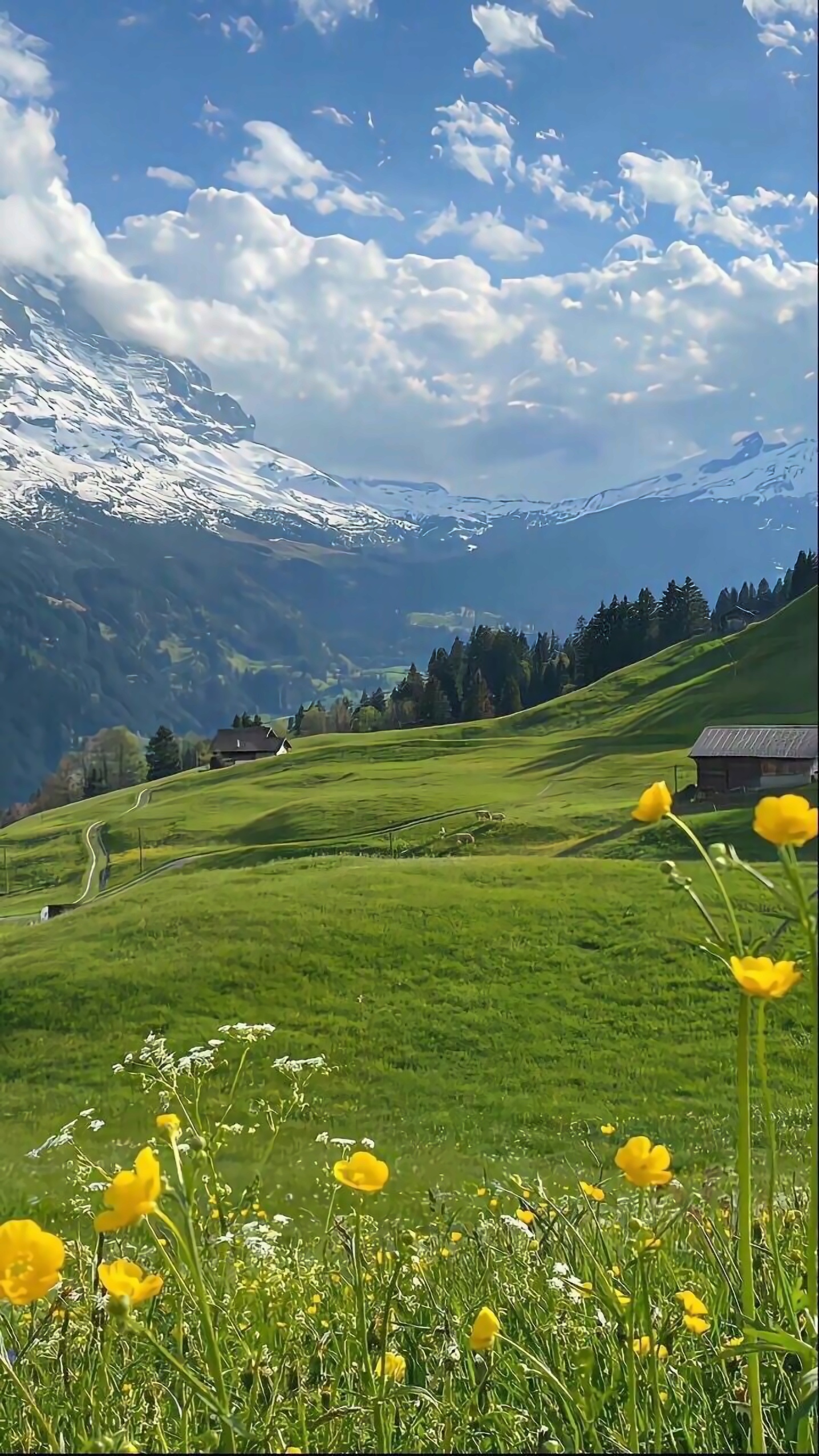 Introducing 'Mountain Serenity: A Floral Embrace,' a breathtaking visual that captures the essence of nature's beauty in the Alps. This artwork showcases vibrant yellow flowers in the foreground, set against a backdrop of rolling green hills and majestic snow-capped mountains under a bright blue sky. The idyllic scene evokes a sense of peace and tranquility, inviting viewers to immerse themselves in the harmony of nature. Perfect for those who appreciate the splendor of the outdoors and the calming power of floral landscapes.
