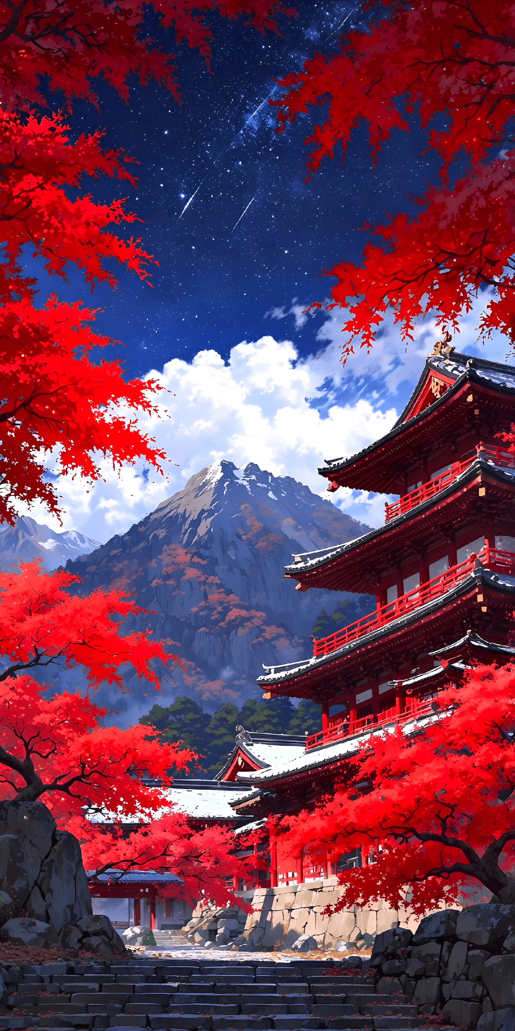 Welcome to 'Harmony of Nature: The Crimson Sanctuary,' a breathtaking scene that captures the essence of tranquility and beauty in a traditional setting. This stunning image showcases a vibrant landscape adorned with fiery red maple trees, their leaves creating a striking contrast against the serene backdrop of a majestic mountain range. A traditional pagoda stands proudly in the foreground, its intricate architecture harmonizing with the natural surroundings. Above, a starry sky twinkles with shooting stars, adding a touch of magic to the scene. This artwork embodies the perfect blend of nature and culture, inviting viewers to immerse themselves in a moment of peace and reflection.