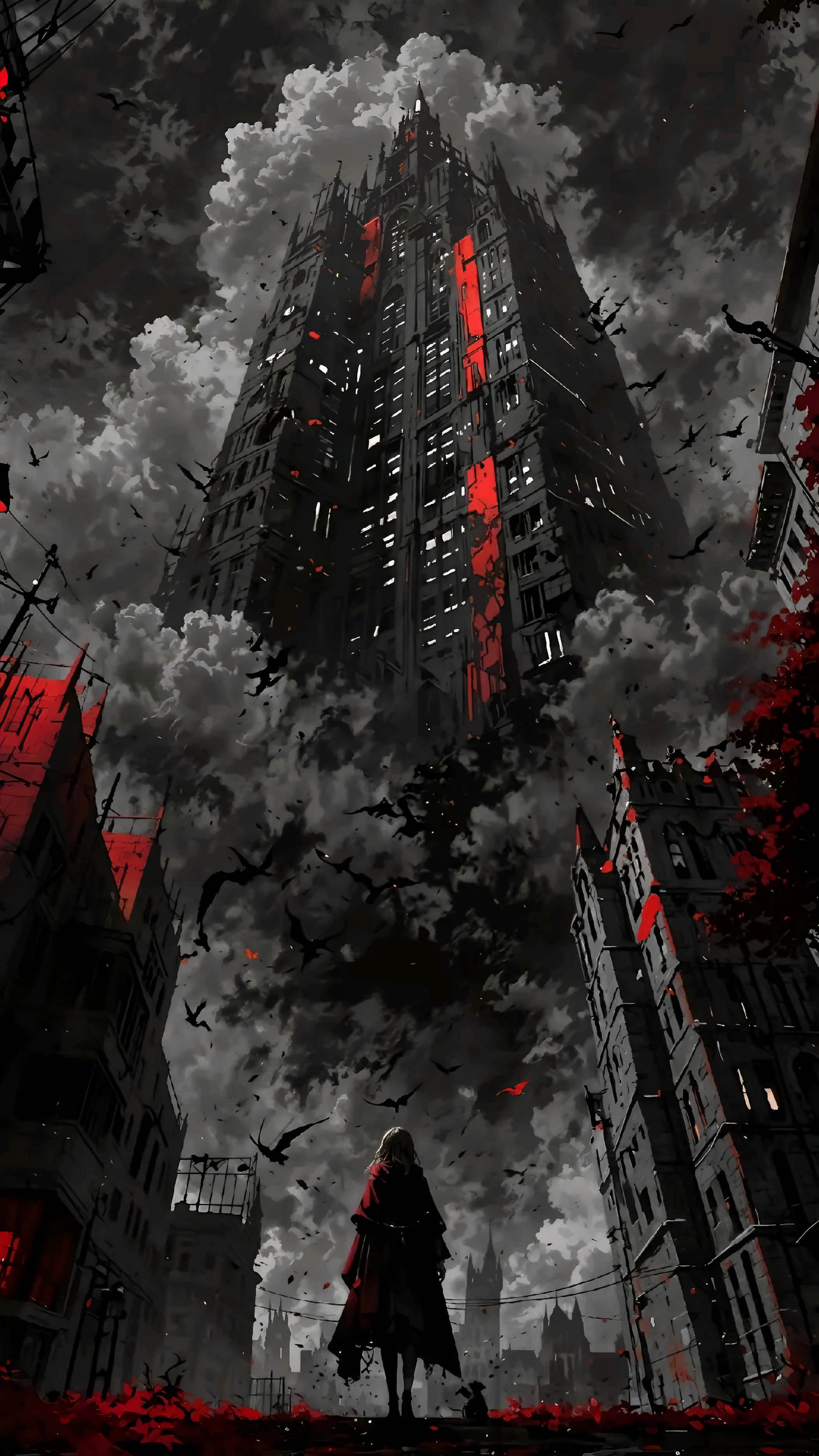 Step into 'Eclipse of the Tower: A Dark Ascendancy,' a haunting portrayal of a dystopian landscape dominated by a massive, foreboding tower. This striking image captures a lone figure standing in the foreground, cloaked in shadows, as they gaze up at the towering structure that pierces the stormy sky. Dark clouds swirl ominously above, while streaks of red light bleed through the building's facade, hinting at the chaos within. Bats flit through the air, adding to the eerie atmosphere, while the scattered red leaves on the ground evoke a sense of decay and desolation. This artwork encapsulates themes of isolation, power, and the struggle against an overwhelming force in a world on the brink of collapse.