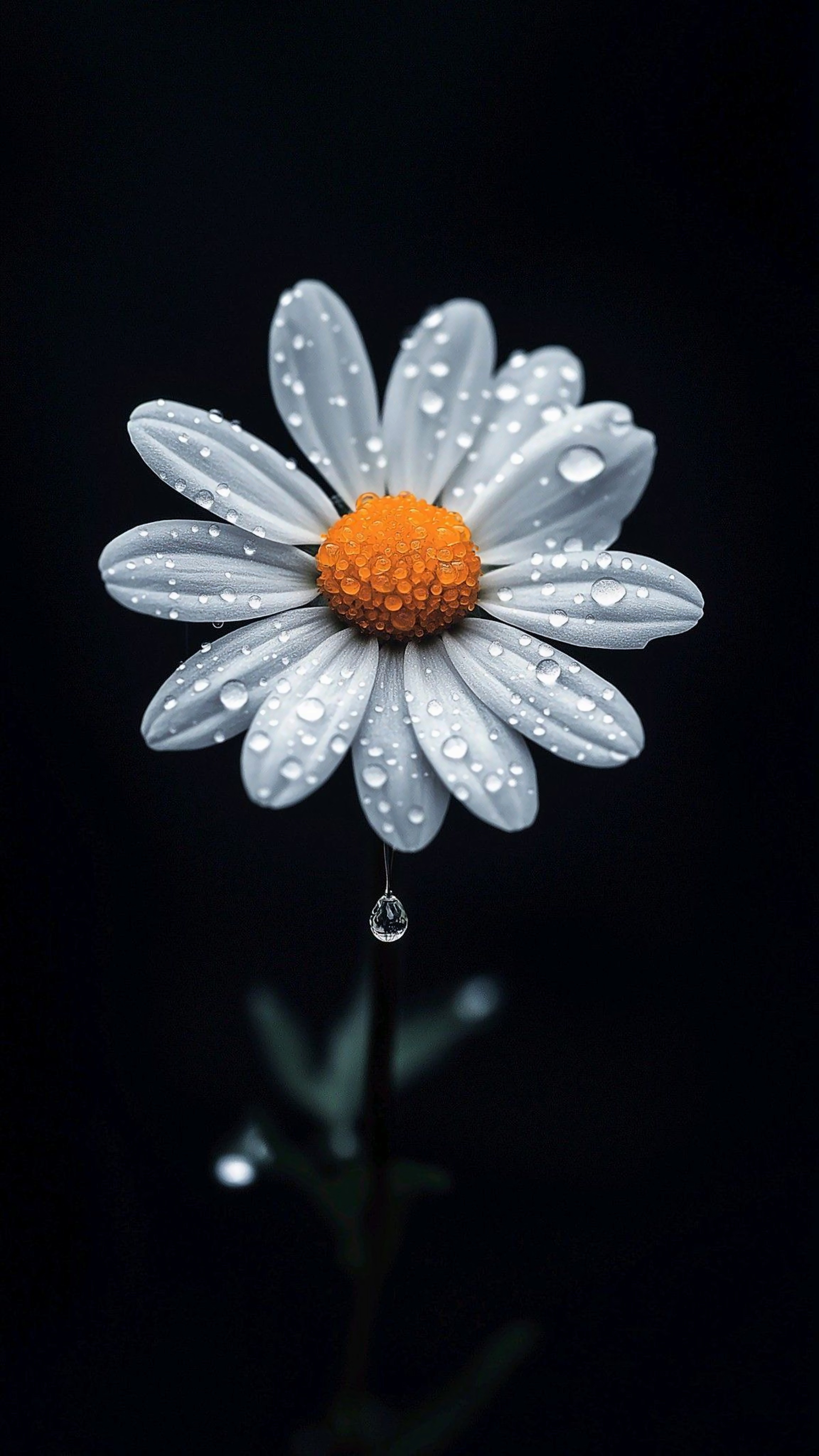 Presenting 'Nature's Jewel: The Dew-Kissed Daisy,' a stunning wallpaper that captures the delicate beauty of nature. This exquisite image features a single daisy with bright white petals and a vibrant orange center, adorned with glistening droplets of water. Set against a dark background, the contrast highlights the intricate details of the flower and the shimmering droplets, evoking a sense of tranquility and freshness. Perfect for nature lovers and those seeking a serene touch for their digital space, this wallpaper invites you to appreciate the simple yet profound beauty of the natural world.