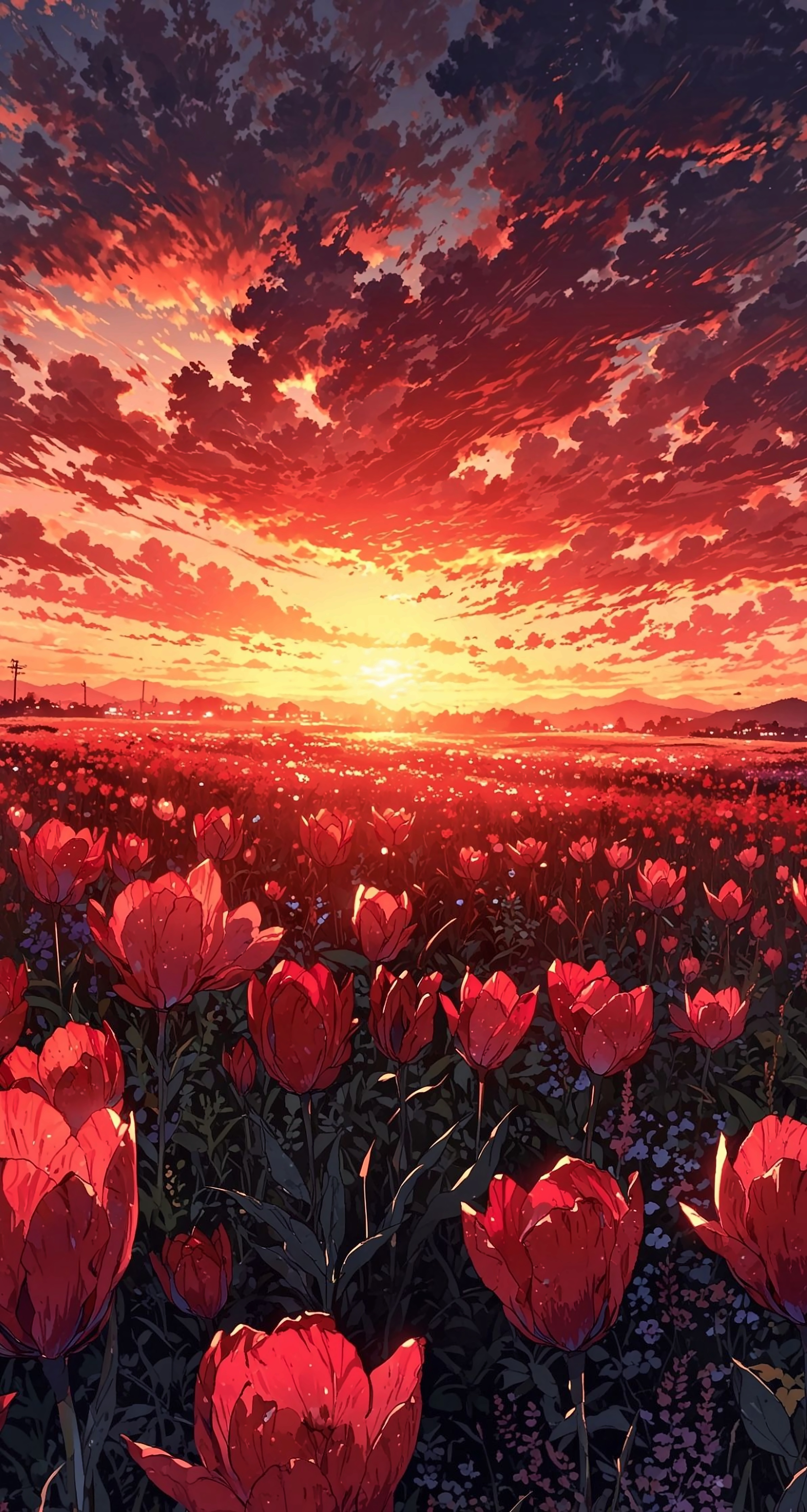 Download WallpaperCrimson Horizon: Sunset Over the Tulip Field