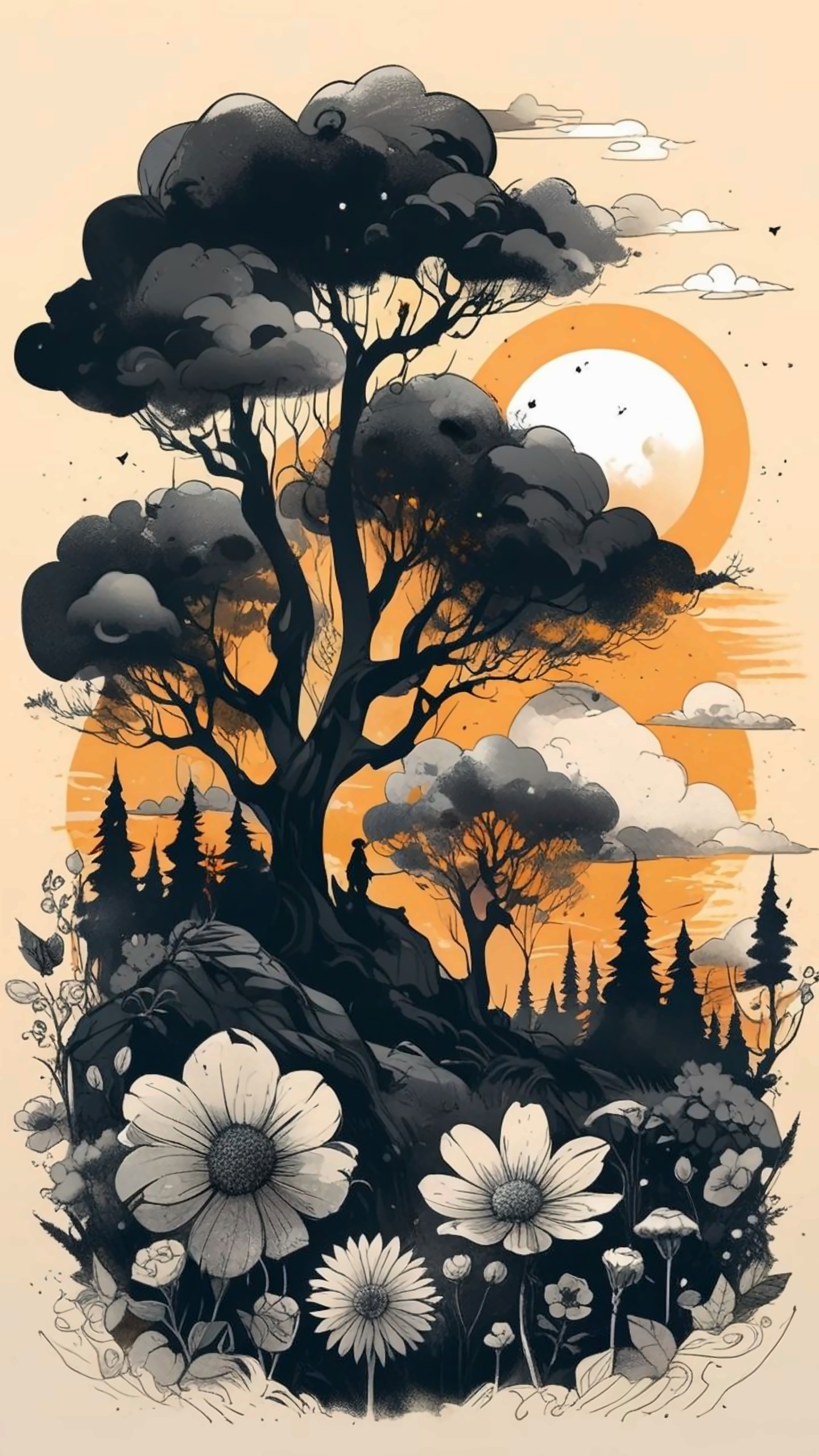 Introducing 'Whispers of Nature: The Enchanted Grove,' a stunning wallpaper that beautifully blends elements of nature with artistic flair. This artwork features a majestic tree silhouetted against a vibrant orange sunset, surrounded by a serene landscape of wildflowers in shades of white and soft pastels. The contrast between the dark foliage and the warm background creates a captivating visual effect, inviting viewers to immerse themselves in the tranquility of the scene. Ideal for nature enthusiasts and lovers of artistic landscapes, this wallpaper serves as a reminder of the beauty found in the natural world.