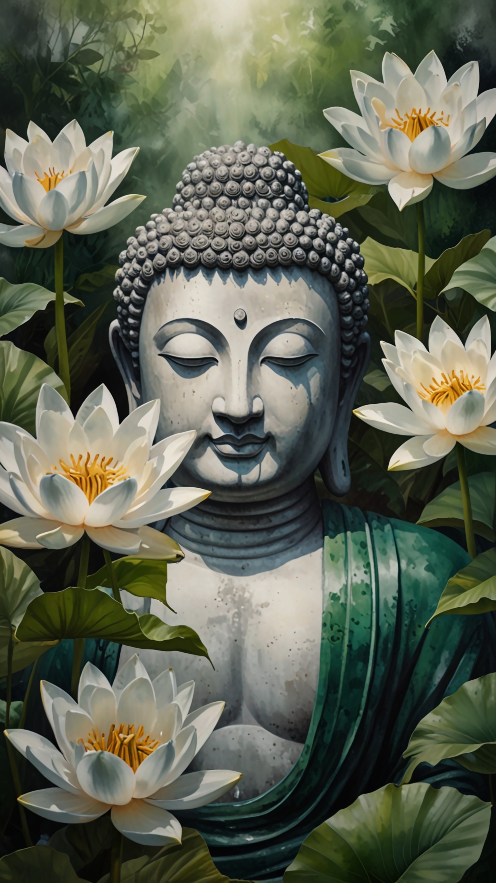 Introducing 'Tranquil Enlightenment: The Lotus Buddha,' a serene wallpaper that embodies peace and spirituality. This captivating artwork features a beautifully detailed Buddha statue, partially obscured by lush green foliage and delicate white lotus flowers. The gentle light filtering through the trees creates an ethereal atmosphere, inviting viewers to reflect on themes of mindfulness and inner peace. Perfect for those seeking inspiration and calm in their digital spaces, this wallpaper serves as a reminder of the beauty of nature and the pursuit of enlightenment.
