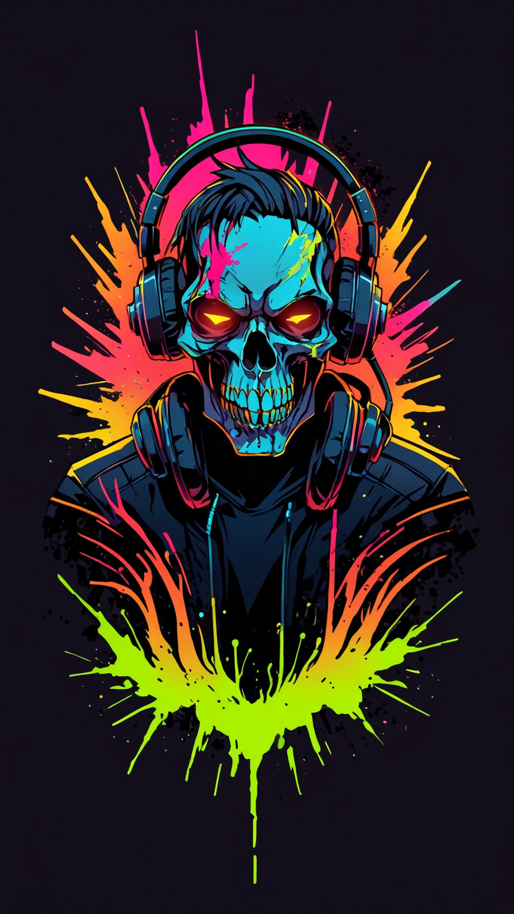 Introducing 'Bass of the Undead: The Sonic Skull,' a striking wallpaper that combines the worlds of music and the macabre. This electrifying artwork showcases a vividly colored skull adorned with headphones, set against a backdrop of explosive splashes of neon colors. The intense red and green highlights in the skull's glowing eyes add an element of fierce energy, making it perfect for music lovers and those who embrace a bold aesthetic. Ideal for gamers, DJs, and anyone who thrives in the vibrant pulse of nightlife.