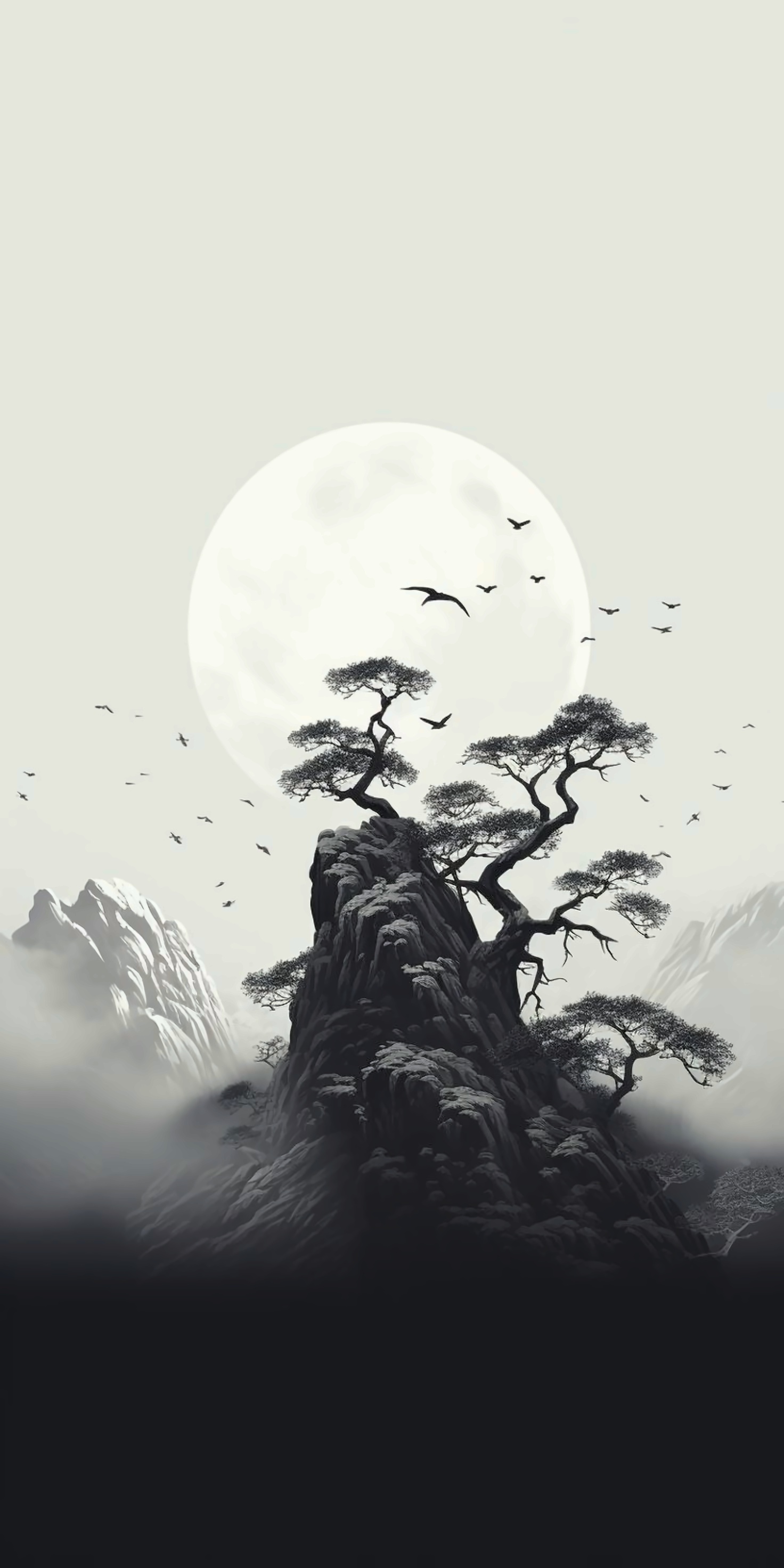 Introducing 'Moonlit Serenity: The Timeless Tree,' an evocative wallpaper that captures the tranquility of nature under the glow of a full moon. This stunning artwork features a solitary tree perched on a rocky outcrop, surrounded by misty mountains and a flock of birds soaring across the night sky. The monochromatic palette, combined with the soft illumination of the moon, creates a peaceful and contemplative atmosphere, inviting viewers to reflect on the beauty of solitude and the natural world. Perfect for those who appreciate minimalist art and the serenity of nature.