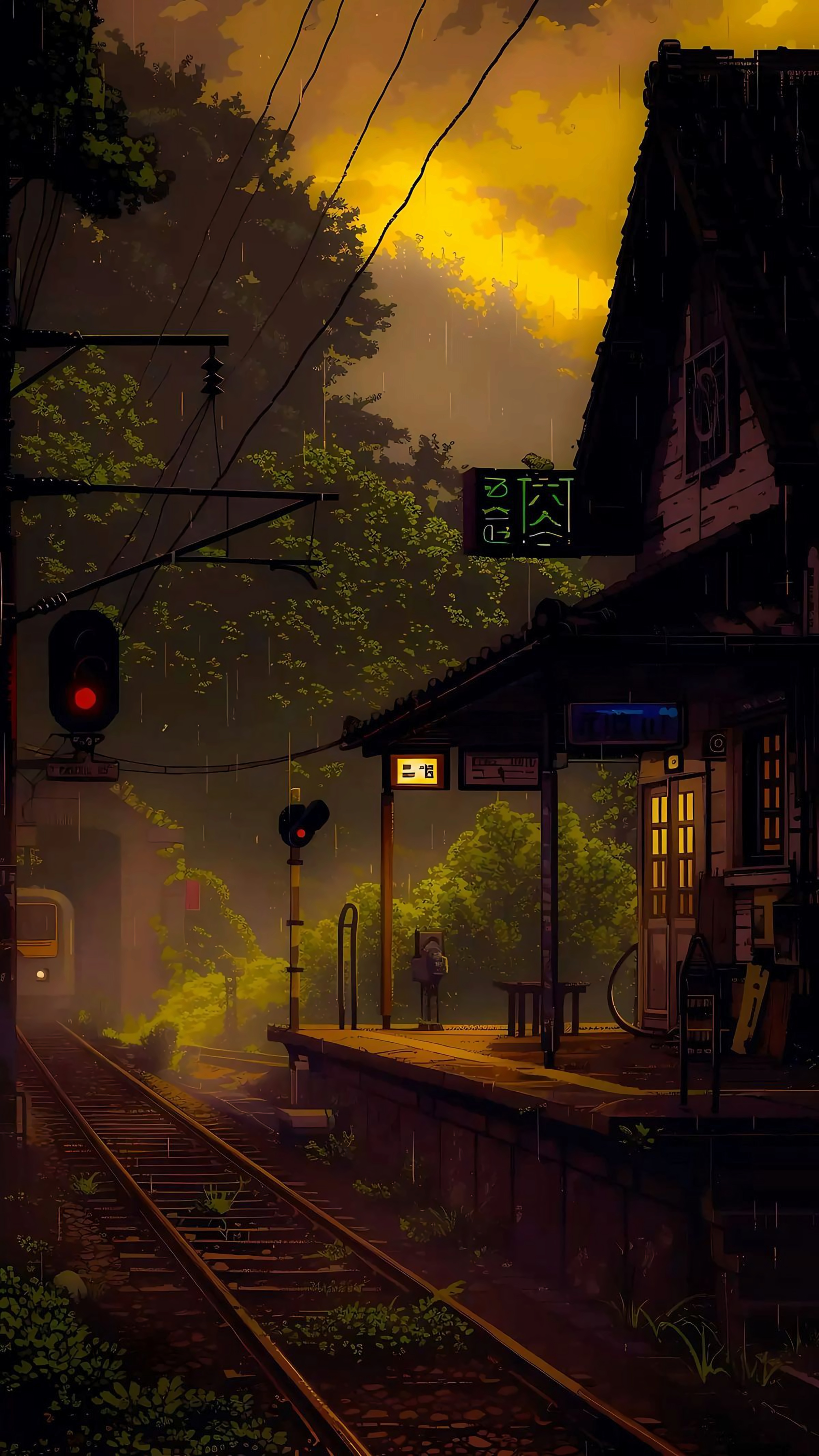 Introducing 'Rainy Station: Echoes of Solitude,' a captivating wallpaper that encapsulates the serene beauty of a rainy evening at a secluded train station. This artwork features a detailed scene of a quaint station surrounded by lush greenery, illuminated by the warm glow of street lamps under a moody sky. The gentle rain creates a reflective surface on the platform, enhancing the overall atmosphere of tranquility and introspection. Ideal for those who appreciate the beauty of solitude and the charm of rural landscapes, this wallpaper transforms any screen into a peaceful escape.