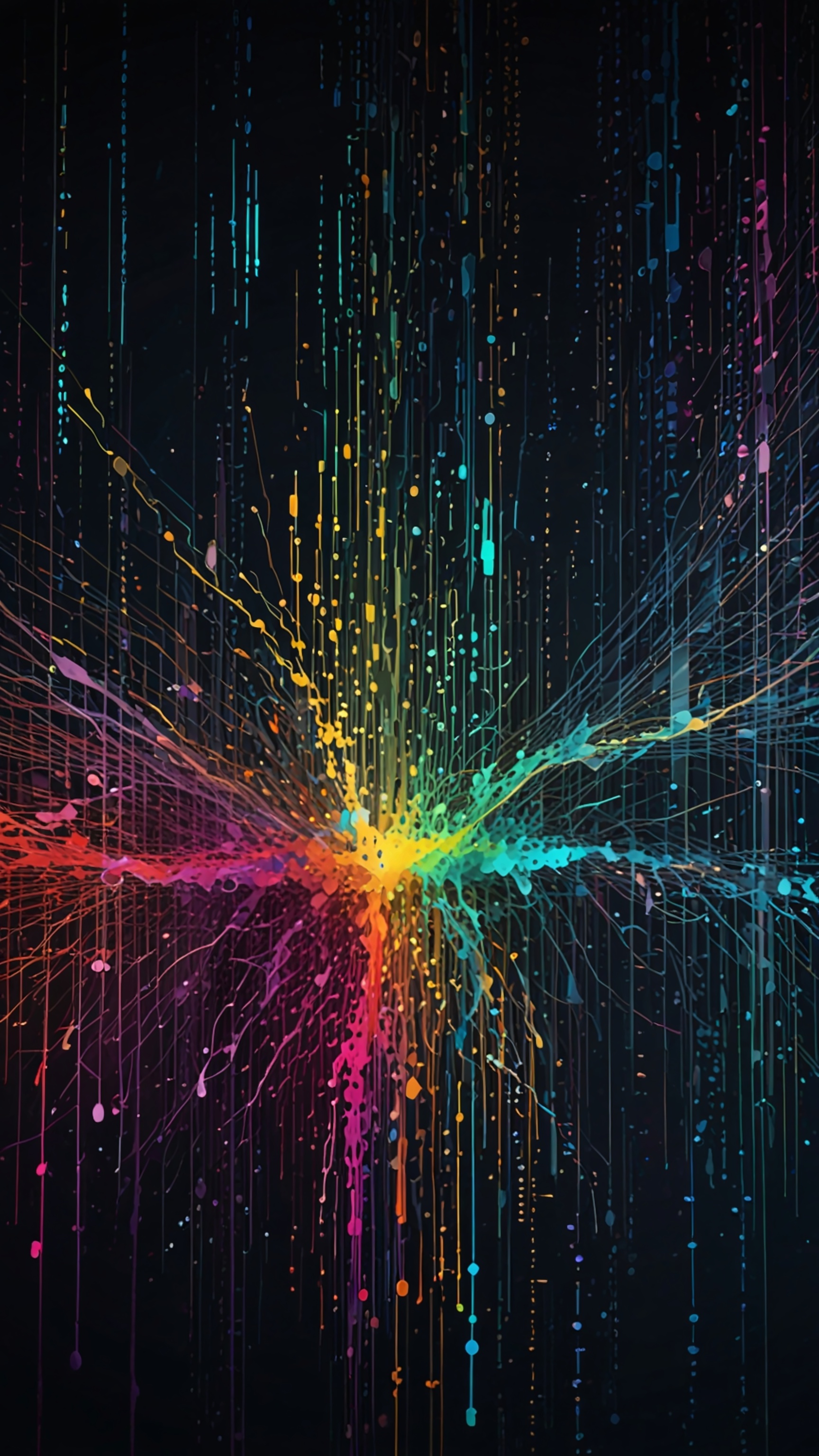 Introducing 'Spectrum Burst: The Dance of Colors,' an electrifying wallpaper that captures the essence of energy and creativity. This stunning artwork features an explosion of vibrant colors radiating from a central point, creating a mesmerizing effect of flowing lines and dots that dance across the dark background. The interplay of hues from warm reds and oranges to cool blues and greens evokes a sense of movement and vitality, making it perfect for anyone seeking inspiration and a burst of creativity in their digital space.