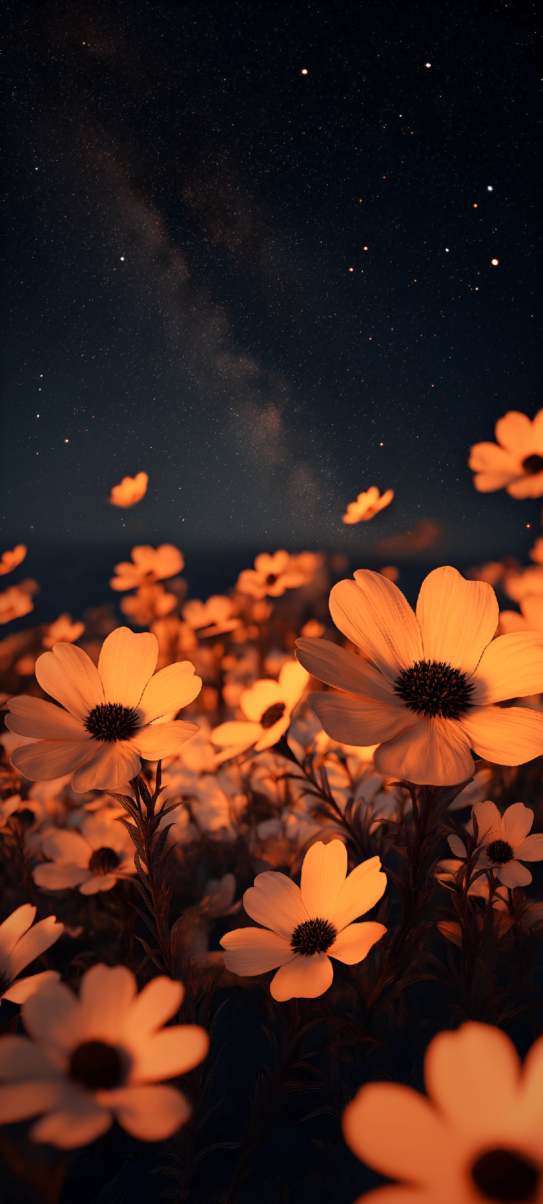 Experience the enchanting beauty of nature with 'Celestial Blooms: A Night Under the Stars.' This captivating wallpaper features a field of delicate flowers illuminated by a warm, golden glow against the backdrop of a stunning starry sky. The contrast between the vibrant blooms and the dark cosmos creates a magical atmosphere, inviting viewers to immerse themselves in the serenity of a peaceful night. Each flower appears to dance under the celestial lights, symbolizing hope and tranquility amidst the vastness of the universe.
