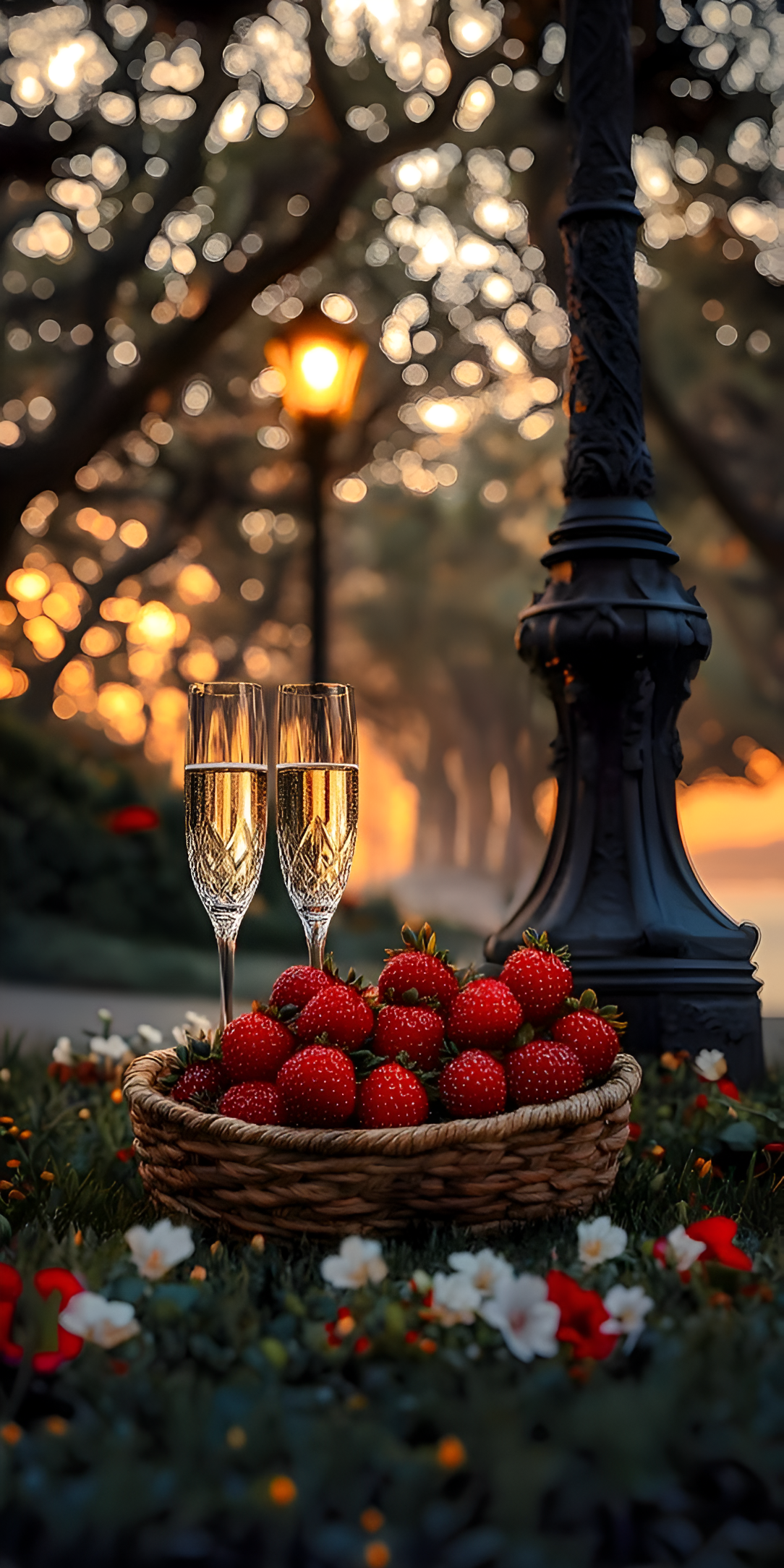 Indulge in the charm of 'Romantic Evening: Bubbles and Berries.' This enchanting image captures a serene moment in a picturesque outdoor setting, featuring a woven basket brimming with fresh strawberries, complemented by two elegant champagne flutes filled with sparkling bubbles. The soft, golden glow of the sunset filters through the trees, creating a dreamy bokeh effect that adds to the romantic ambiance. This artwork evokes feelings of celebration, love, and the simple pleasures of life, making it the perfect backdrop for intimate gatherings or special occasions.