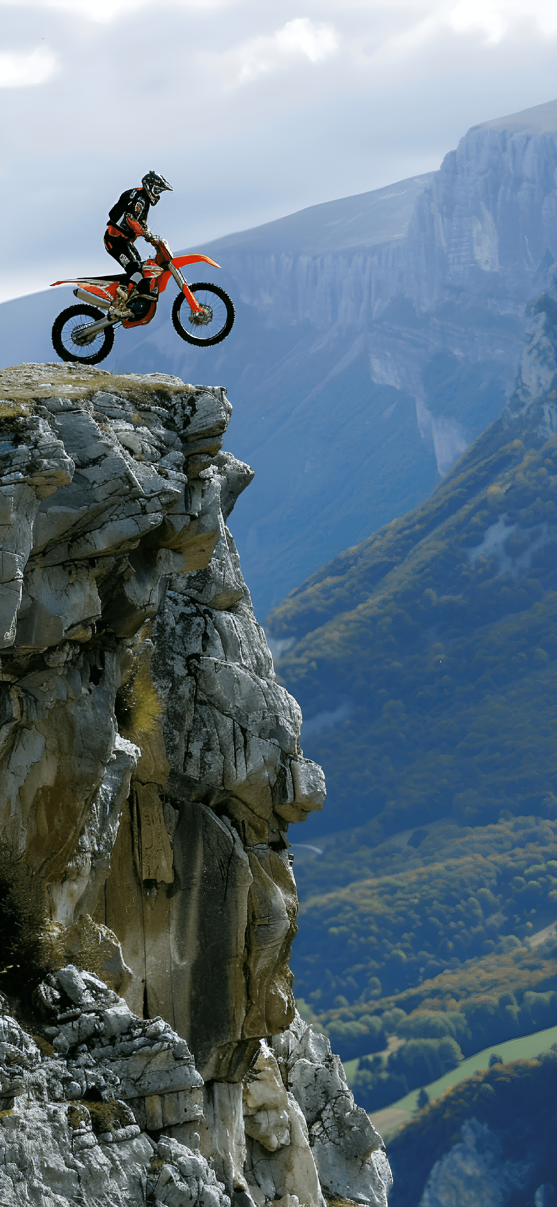 Experience the adrenaline rush of 'Edge of Adventure: Motocross Thrill.' This stunning image captures a fearless motocross rider poised atop a rocky cliff, overlooking a breathtaking mountain landscape. The rider, clad in protective gear, balances expertly on their vibrant orange motorcycle, embodying the spirit of adventure and daring. The dramatic backdrop of towering mountains and lush valleys enhances the sense of height and excitement, inviting viewers to feel the thrill of the ride and the beauty of nature's grandeur. Perfect for those who seek adventure and the thrill of the outdoors.