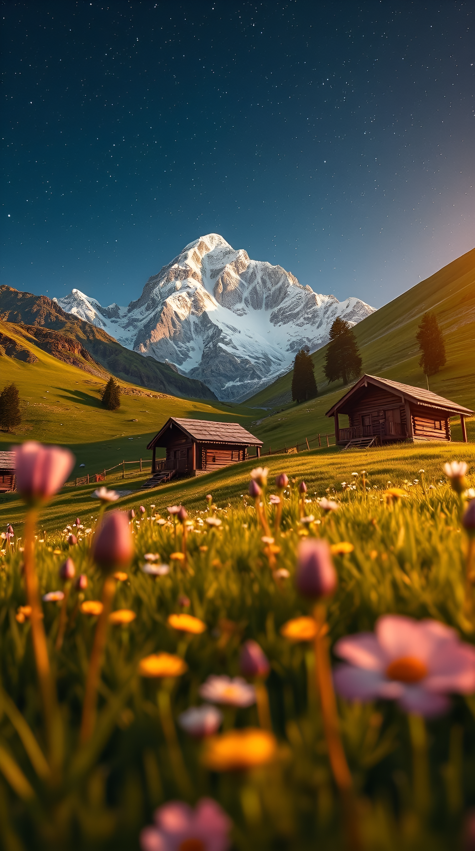 Experience the breathtaking beauty of 'Majestic Serenity: Mountain Dawn.' This stunning artwork captures a tranquil mountain scene at dawn, where the sun's golden rays illuminate the snow-capped peaks of a majestic mountain range. In the foreground, vibrant wildflowers bloom in a lush green meadow, creating a picturesque contrast against the serene backdrop. The clear blue sky, dotted with stars, enhances the peaceful ambiance of this idyllic landscape, inviting viewers to immerse themselves in nature's splendor and the calmness of the early morning.