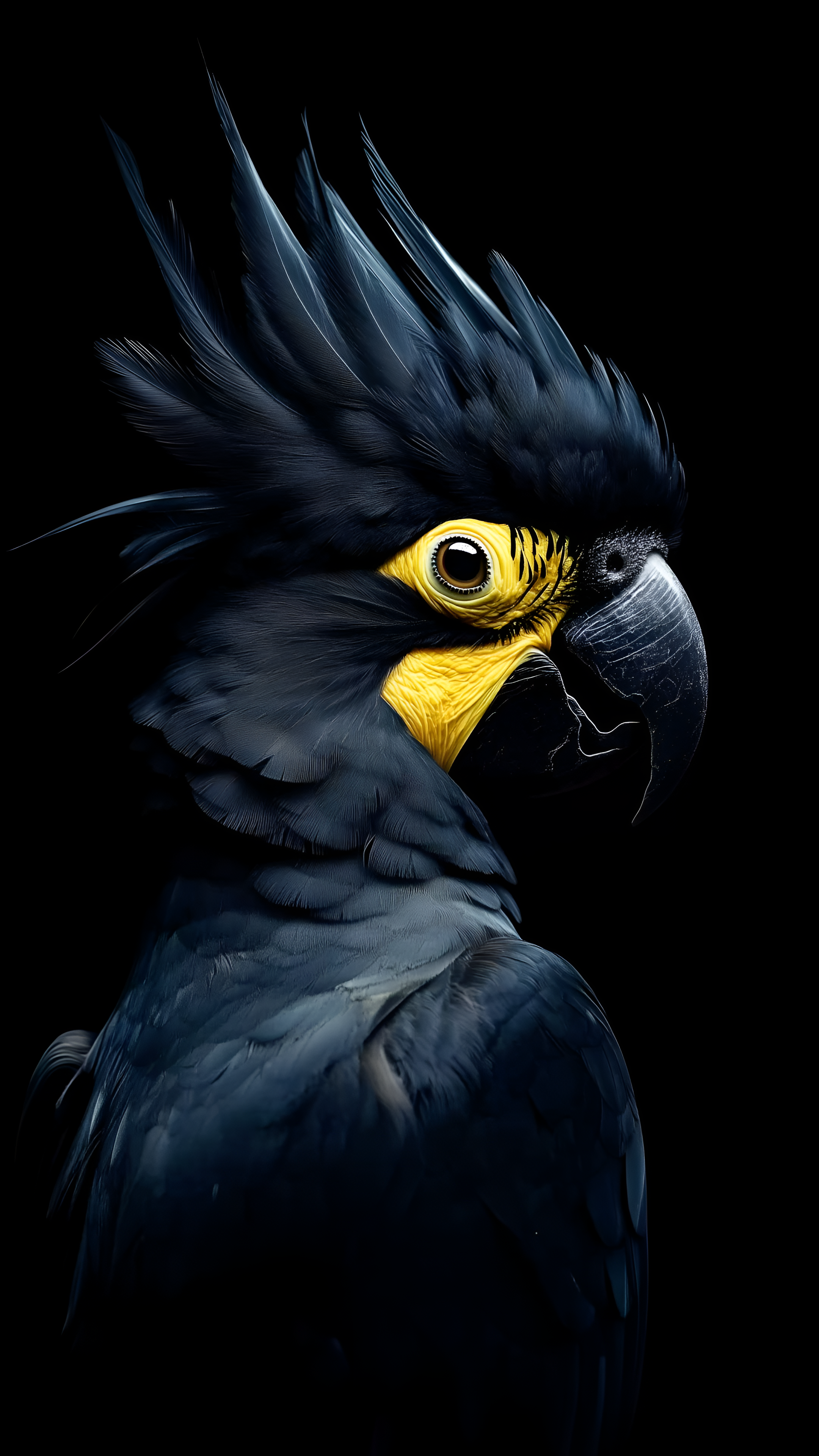 Discover the elegance of the 'Majestic Guardian: The Black Cockatoo.' This stunning close-up portrait showcases the intricate details of this magnificent bird, known for its striking black plumage and vibrant yellow accents. The cockatoo's expressive eyes and bold beak are highlighted against a dramatic black background, emphasizing its regal presence. This artwork captures the essence of nature's beauty and the unique characteristics of this iconic species, inviting viewers to appreciate the splendor of wildlife.