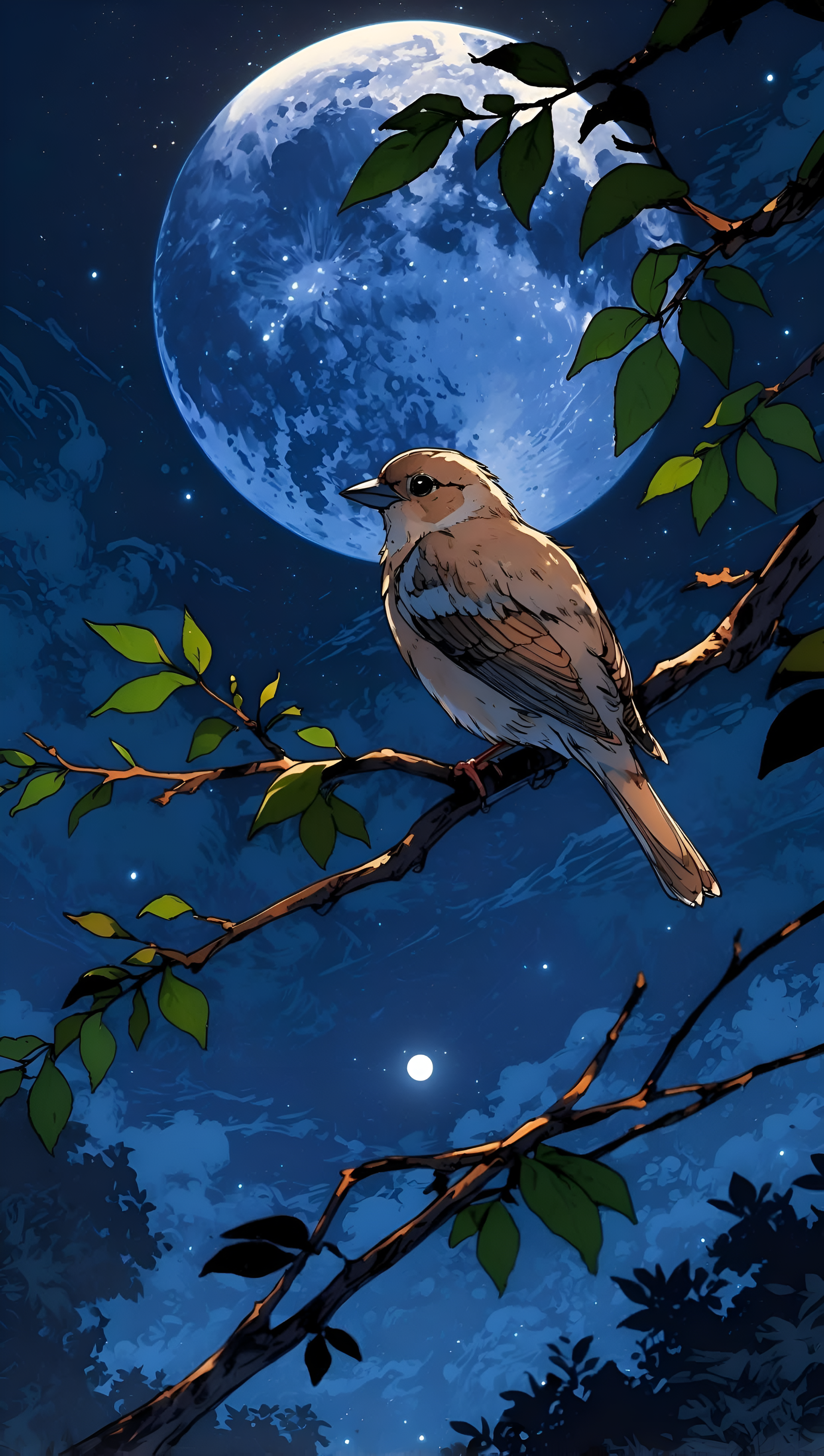 Discover the serene beauty of 'Lunar Serenade: The Night Watcher.' This captivating artwork depicts a charming bird perched on a branch, silhouetted against the backdrop of a luminous full moon. The deep blue night sky, dotted with twinkling stars, creates a tranquil atmosphere, inviting viewers to appreciate the quiet elegance of nature. The delicate leaves and the soft glow of the moonlight enhance the magical ambiance, making this piece a perfect representation of peaceful nights and the wonders of wildlife.
