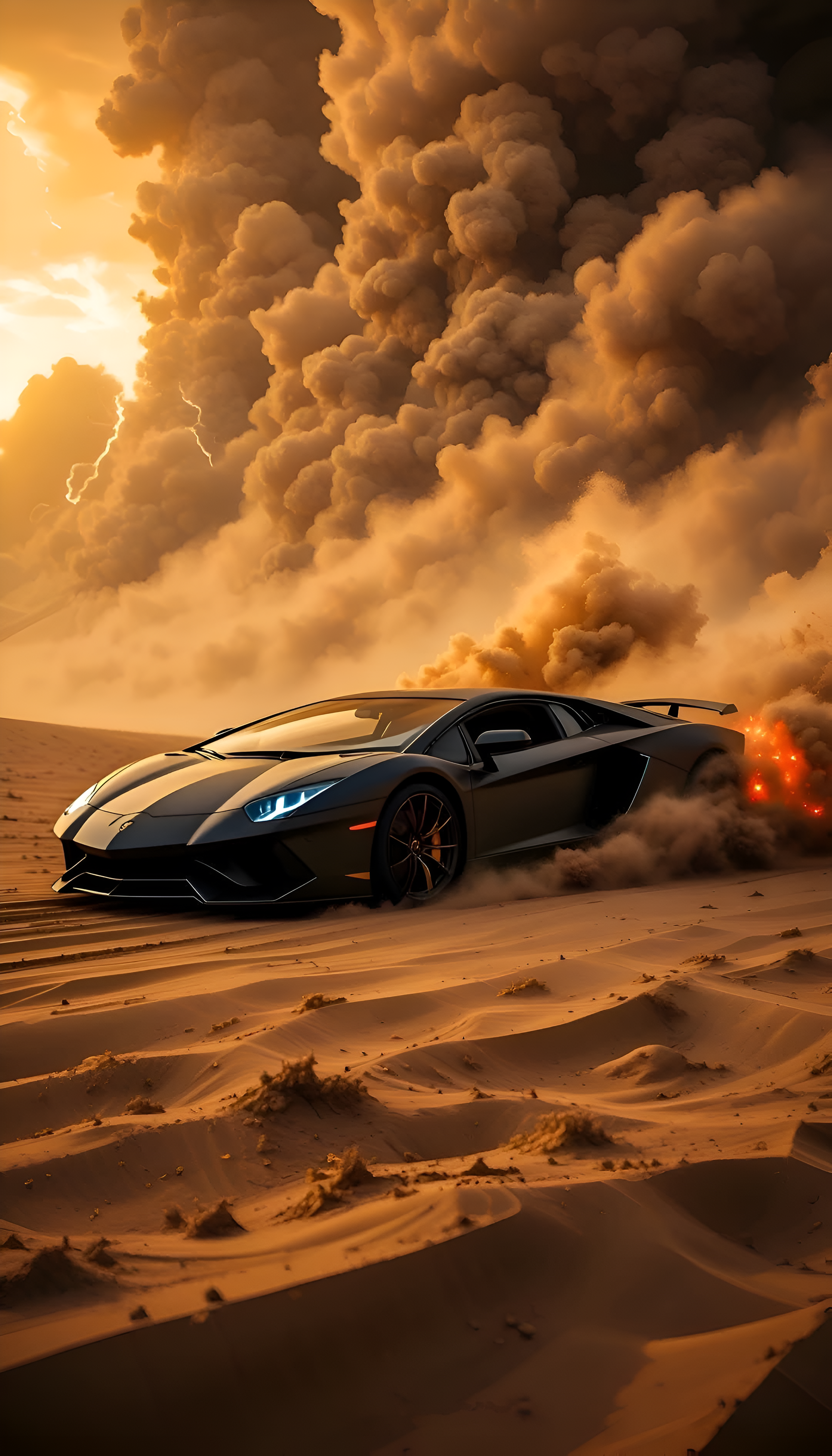Experience the thrill of 'Desert Fury: The Ultimate Speed Machine.' This electrifying image captures a sleek black Lamborghini tearing through a sandy desert, leaving a trail of dust and sparks in its wake. The dramatic backdrop of ominous clouds and flashes of lightning adds an intense atmosphere, highlighting the power and speed of this automotive marvel. As the sun sets, the golden hues reflect off the car's glossy surface, creating a breathtaking contrast that embodies the spirit of adventure and adrenaline.