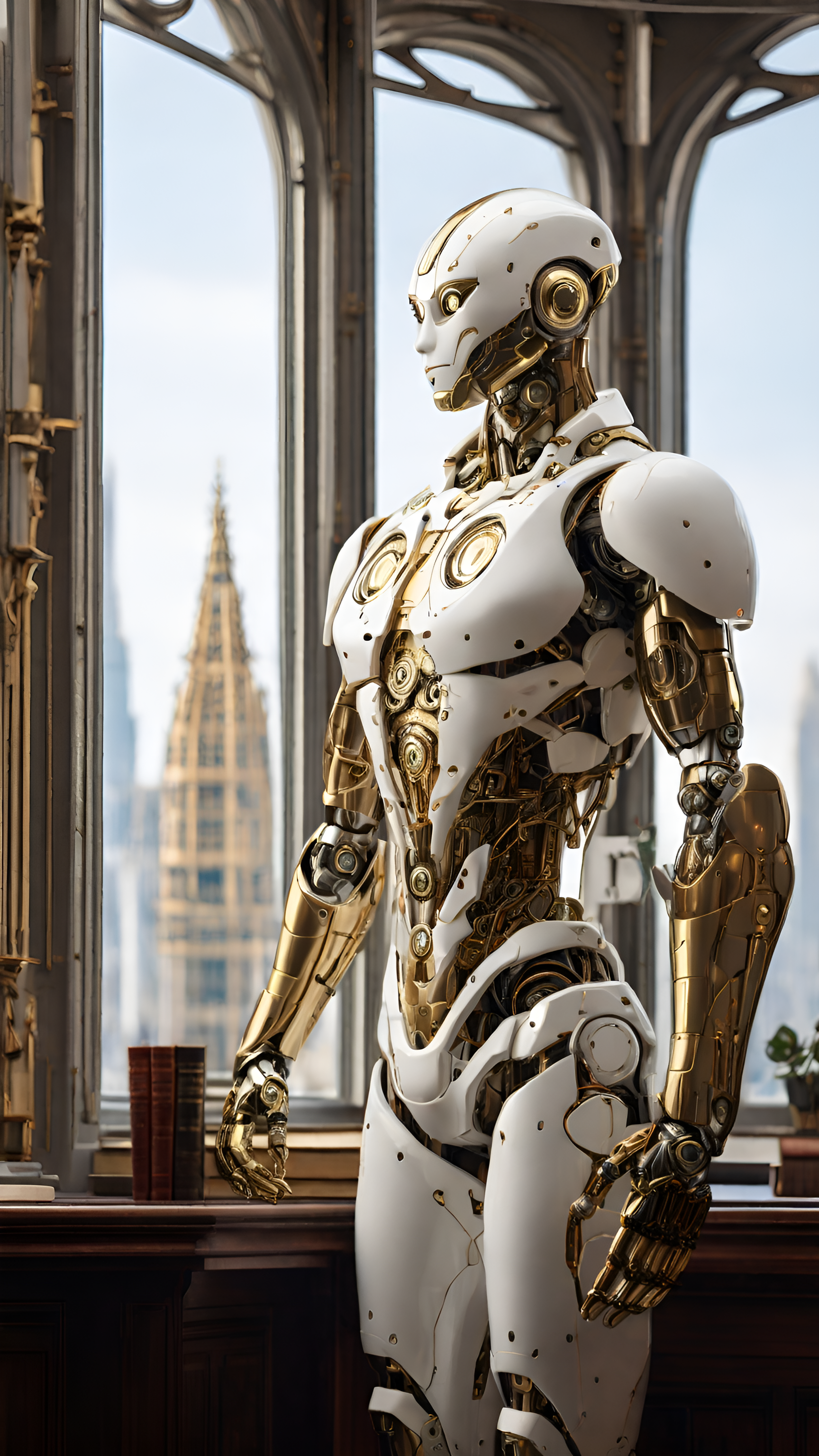 Step into a world where technology meets elegance with 'Regal Automaton: The Guardian of Tomorrow.' This striking image showcases a golden and white robot standing poised in a sophisticated room, framed by grand windows that reveal a cityscape beyond. The intricate design and craftsmanship of the automaton embody the pinnacle of futuristic innovation, symbolizing both strength and grace in a modern era.