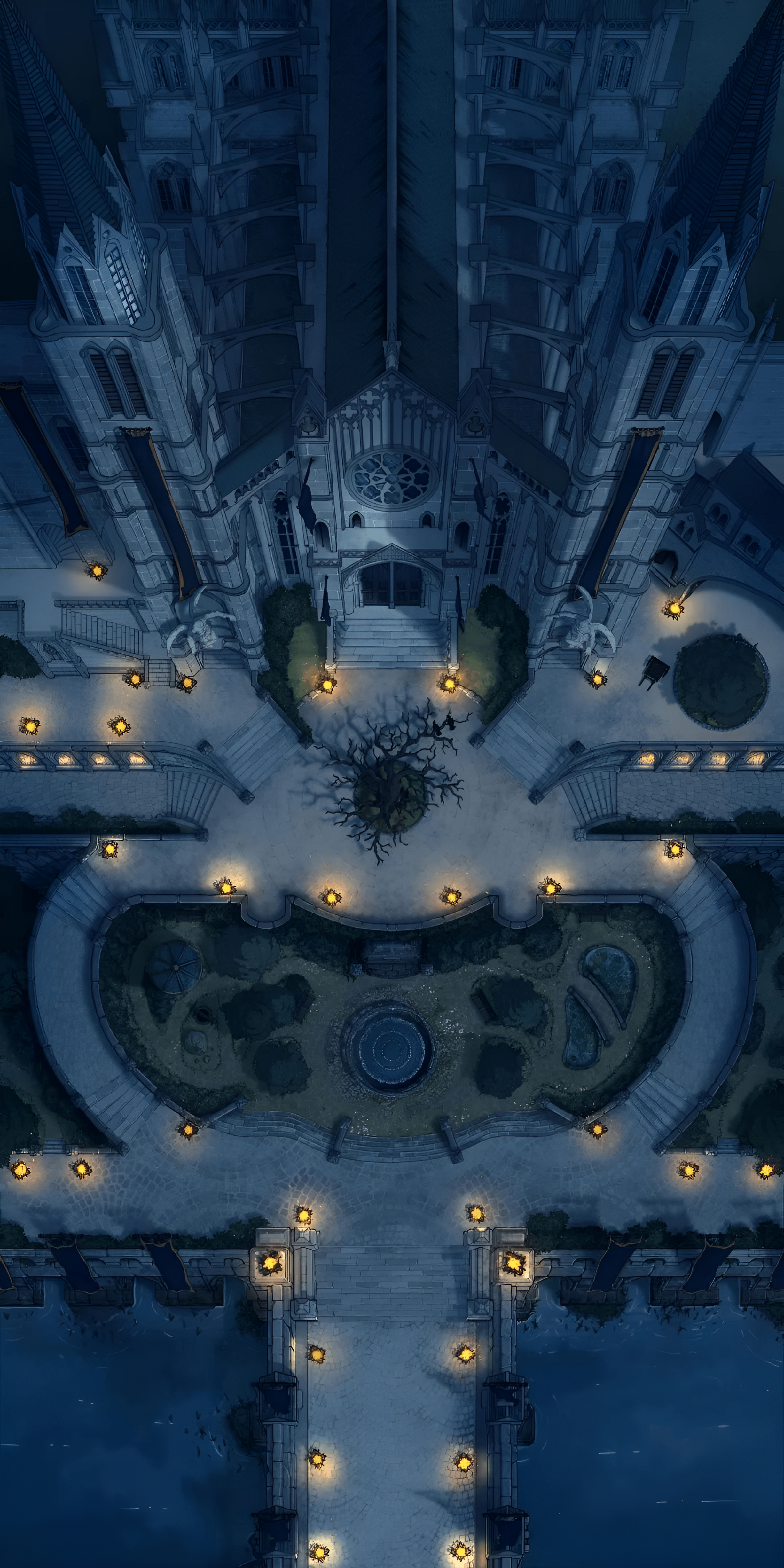 Immerse yourself in the haunting beauty of this gothic cathedral captured from above, illuminated by soft lantern light against a deep blue night sky. The intricate architecture and serene garden pathways create a mystical atmosphere, perfect for fans of dark fantasy and architectural art.