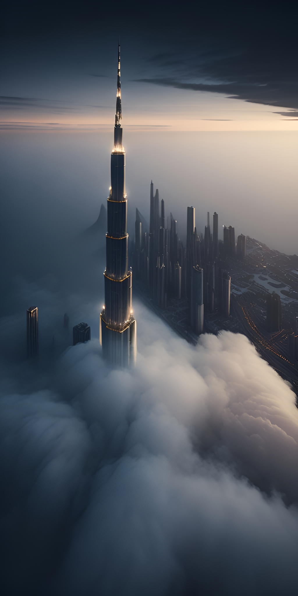 Witness the majestic Burj Khalifa piercing through a sea of clouds during twilight. The iconic skyscraper, illuminated from within, stands as a beacon of innovation and architectural brilliance against the backdrop of a fading day. This image captures the essence of modernity and aspiration, perfect for lovers of urban landscapes and architectural marvels.