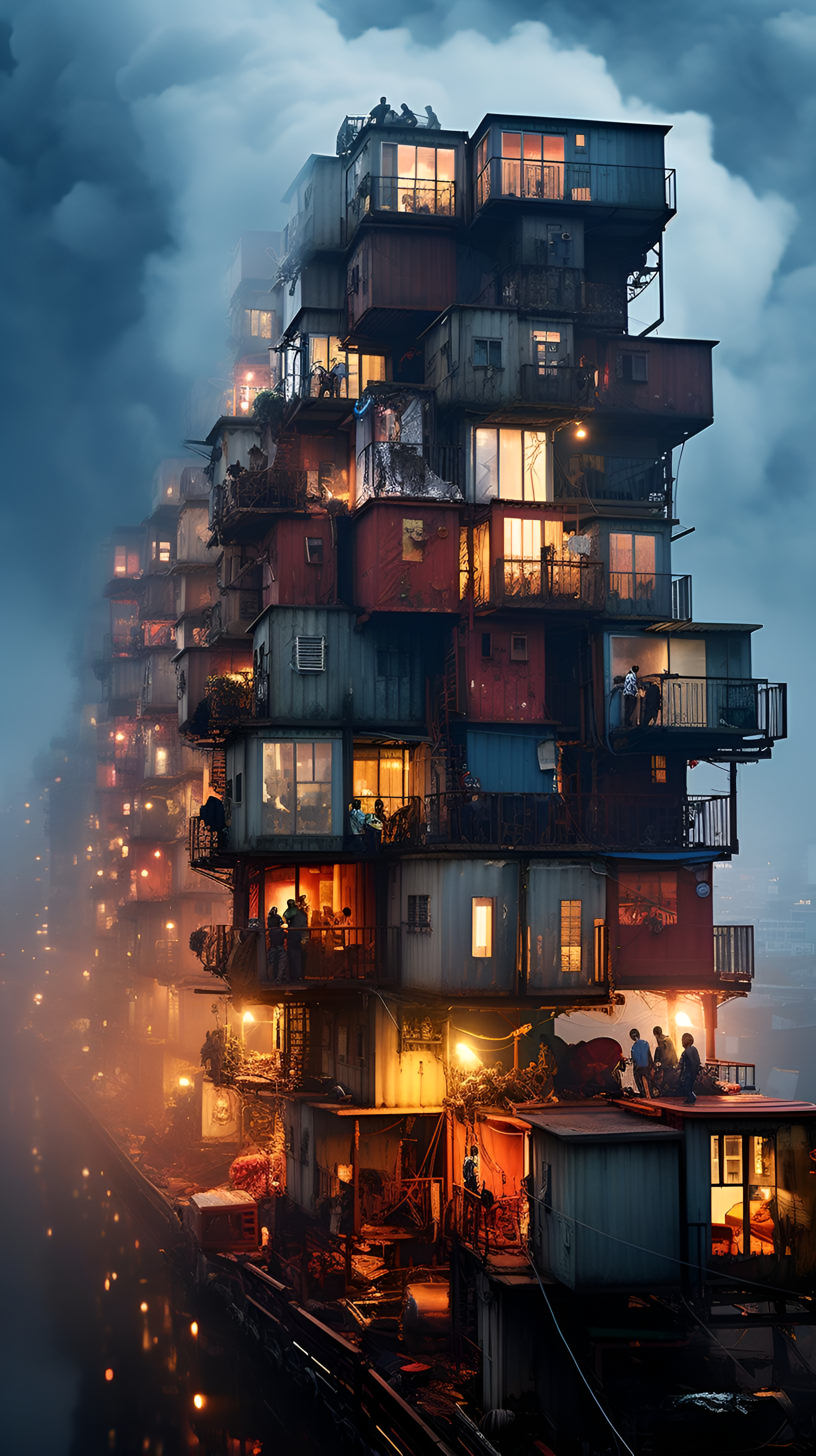 Welcome to 'Urban Jungle: The Stacked Haven,' a captivating glimpse into a futuristic living space that redefines urban architecture. This striking image showcases a towering structure composed of colorful shipping containers, each transformed into cozy homes with warm, inviting lights glowing from within. Surrounded by a mystical fog, the building stands tall against a backdrop of swirling clouds, creating an atmosphere of mystery and intrigue. Residents can be seen enjoying their balconies, hinting at a vibrant community life amidst the urban chaos. This piece perfectly encapsulates the blend of innovation, sustainability, and the human spirit in contemporary living.