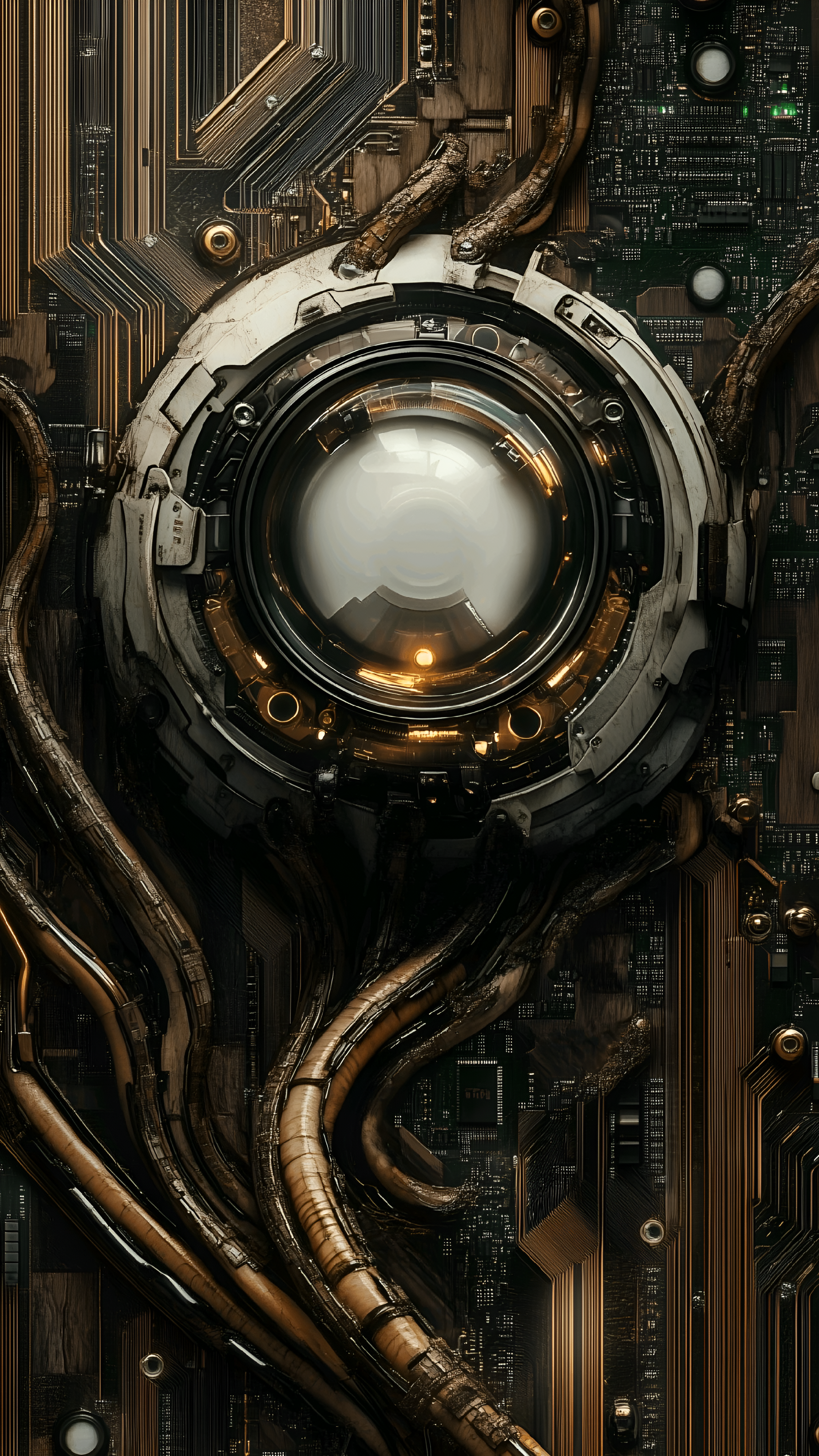 Introducing 'Cyborg Vision: The Mechanical Eye,' a stunning representation of the fusion between technology and organic design. At the center of this captivating image lies a sophisticated mechanical eye, surrounded by intricate circuitry and metallic tendrils that resemble organic veins. The glossy lens captures light, reflecting a hint of the technological world it inhabits. The dark and moody color palette, combined with the warm glow of embedded lights, creates an atmosphere of mystery and intrigue, inviting viewers to ponder the relationship between humanity and technology. This artwork embodies the essence of cybernetic evolution, where machines and biology coexist in harmony.