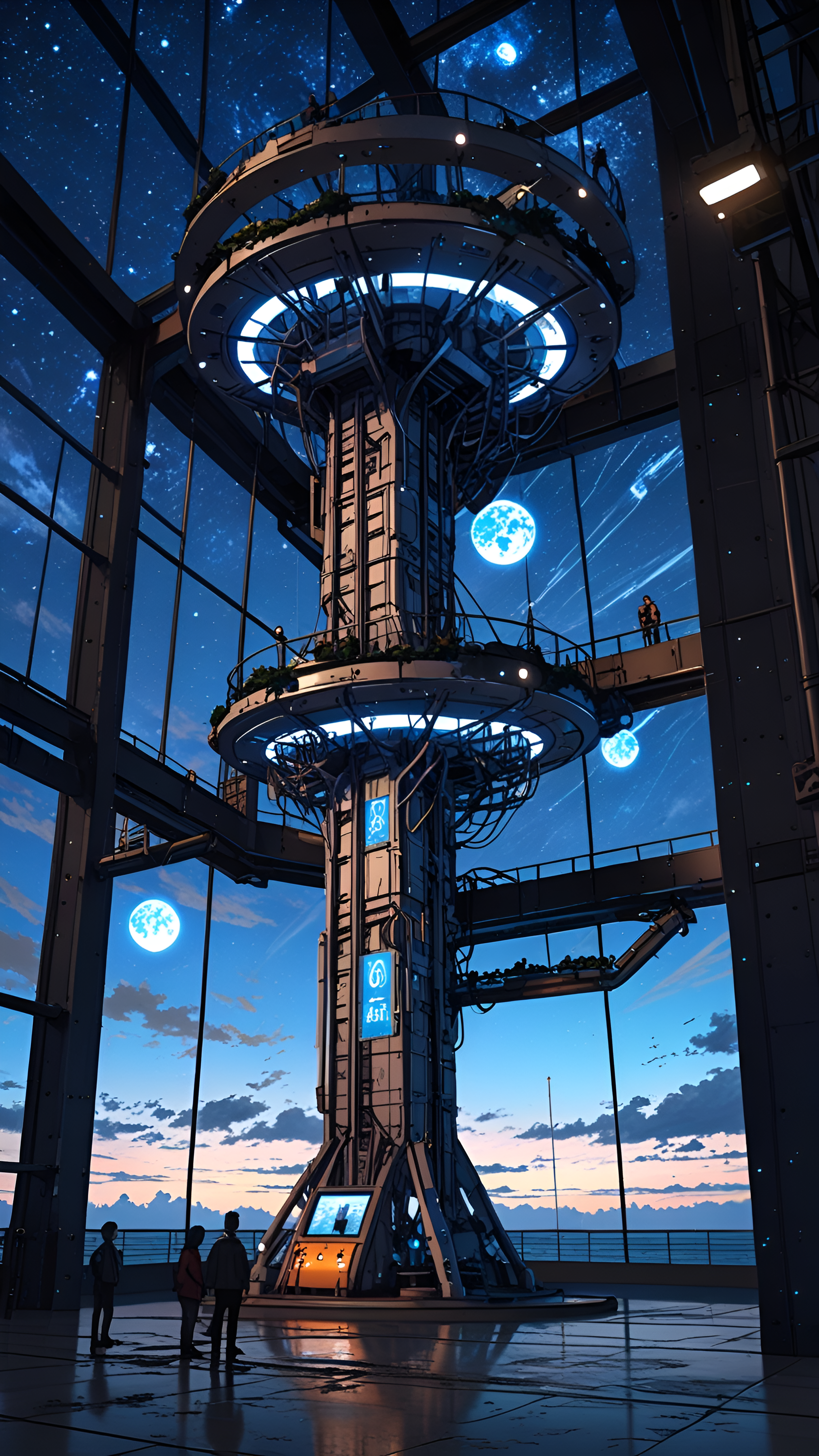 Enter the realm of the extraordinary with 'Celestial Nexus: The Gateway to the Stars.' This stunning artwork depicts a towering structure bathed in ethereal blue light, set against a breathtaking starry sky filled with distant planets and cosmic wonders. The futuristic tower, adorned with intricate details and surrounded by lush greenery, invites viewers to imagine a world where technology and nature coexist harmoniously. Below, figures stand in awe, gazing at the marvel before them, evoking a sense of exploration and adventure. This wallpaper is perfect for those captivated by the mysteries of the universe and the beauty of advanced architecture.