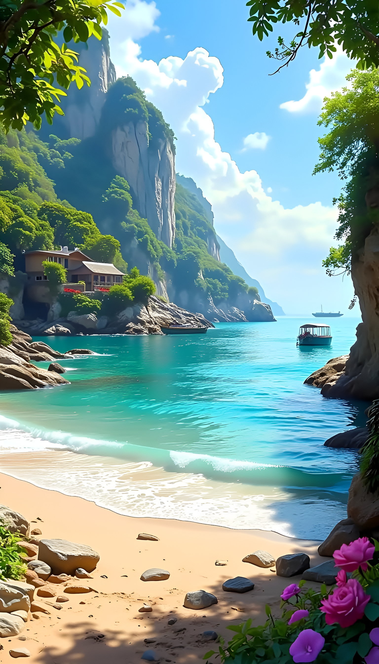 Immerse yourself in the tranquility of 'Tropical Paradise: Serenity by the Shore.' This breathtaking image captures a picturesque beach framed by towering cliffs and lush greenery. A charming house sits nestled among the trees, offering a perfect retreat with vibrant flowers blooming nearby. The crystal-clear turquoise waters gently lap against the soft sandy shore, inviting you to relax and unwind. A small boat floats peacefully in the distance, completing this idyllic coastal scene. Ideal for nature lovers and those seeking a moment of peace, this wallpaper transports you to a serene tropical getaway.