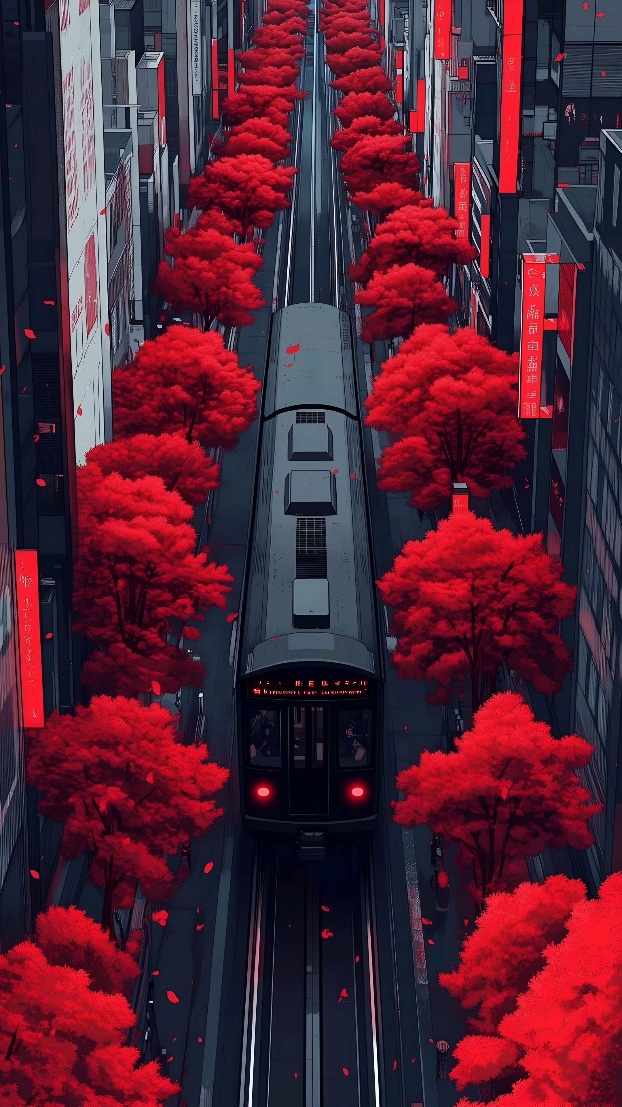 Experience the captivating beauty of 'Crimson Tracks: Journey Through the Urban Canopy.' This stunning artwork depicts a train gliding through a city street lined with vibrant red trees, their leaves fluttering in the breeze. The contrast of the deep reds against the urban backdrop creates a mesmerizing scene, evoking feelings of both adventure and serenity. Neon signs and city structures frame the path, highlighting the intersection of nature and modernity. Perfect for those who appreciate the blend of urban life and natural beauty, this wallpaper invites you to embark on a journey through a world where color and creativity flourish.