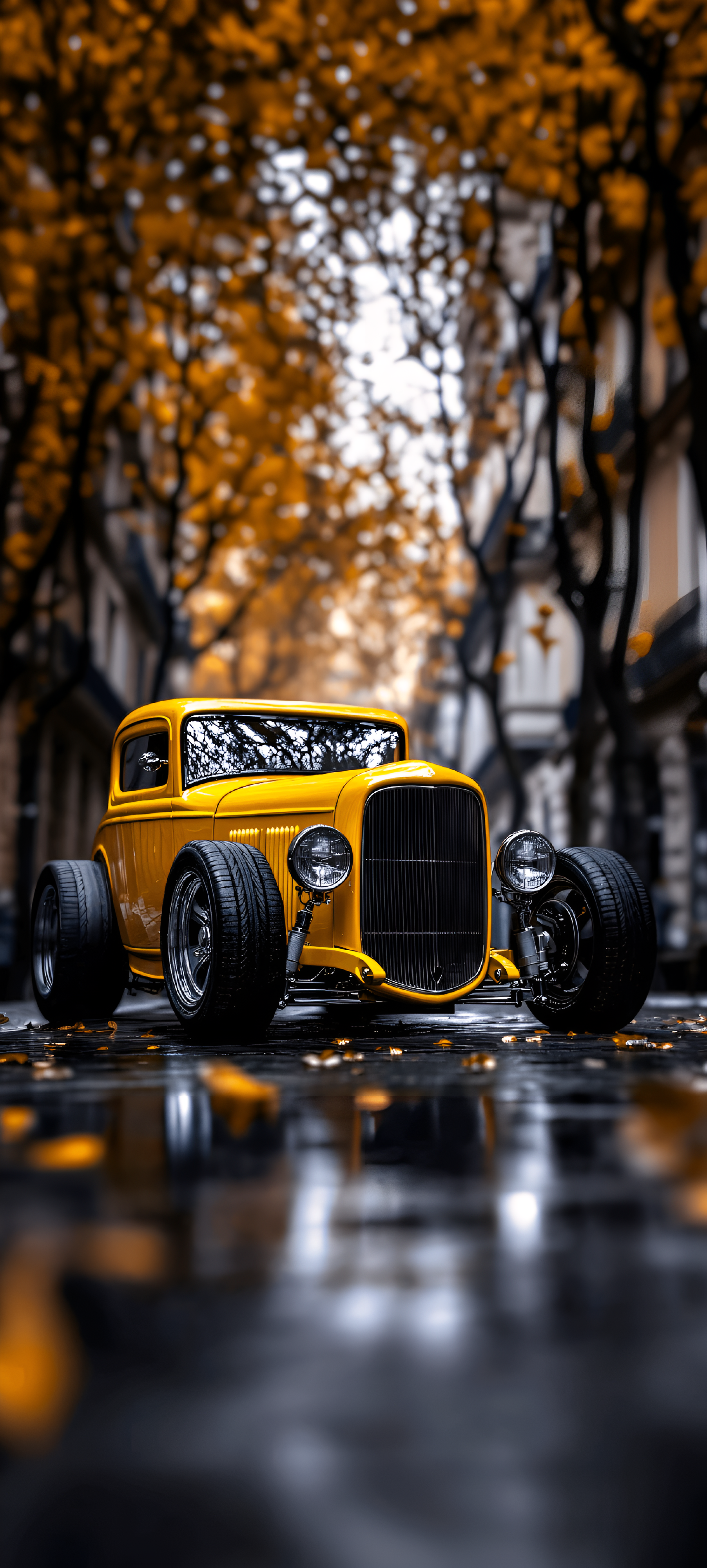 Step into the world of nostalgia with 'Golden Classic: The Vintage Ride.' This striking image features a vibrant yellow vintage car, perfectly positioned on a rain-kissed street adorned with fallen autumn leaves. The backdrop of trees, with their golden foliage, creates a warm and inviting atmosphere, while the reflections on the wet pavement add a touch of elegance. The car's classic design and gleaming chrome details evoke a sense of timeless beauty and craftsmanship. Ideal for car enthusiasts and lovers of vintage aesthetics, this wallpaper captures the essence of a bygone era, blending nature and automotive artistry.