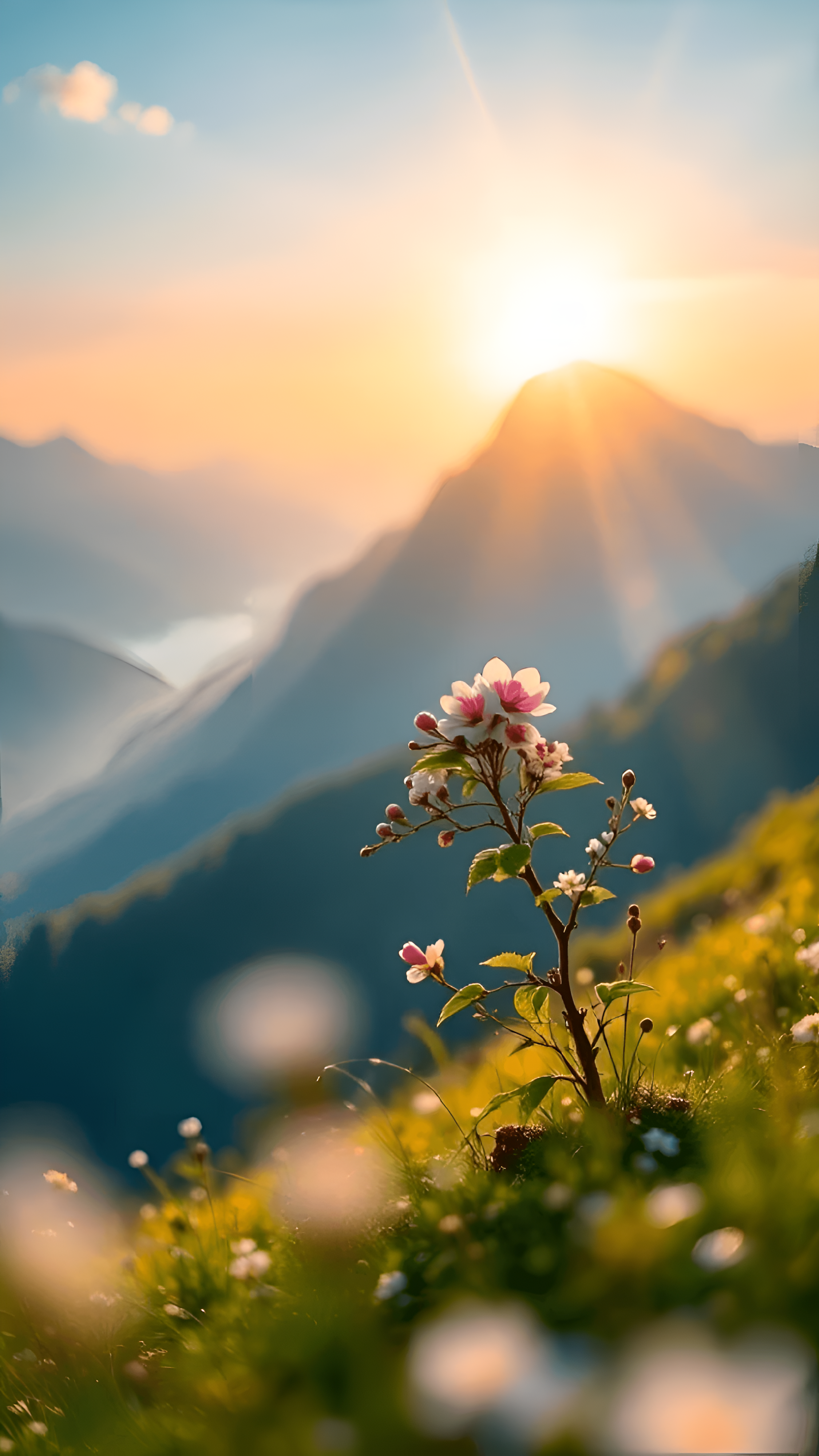 Embrace the beauty of nature with 'Morning Blossom: A New Dawn in Nature.' This enchanting image captures a delicate flower blooming on a mountainside, bathed in the warm glow of the rising sun. The soft light illuminates the petals, creating a serene atmosphere that invites tranquility and reflection. In the background, majestic mountains rise against a pastel sky, hinting at the day's potential. This wallpaper is perfect for nature lovers and those seeking inspiration, reminding us of the beauty that blossoms with each new day.