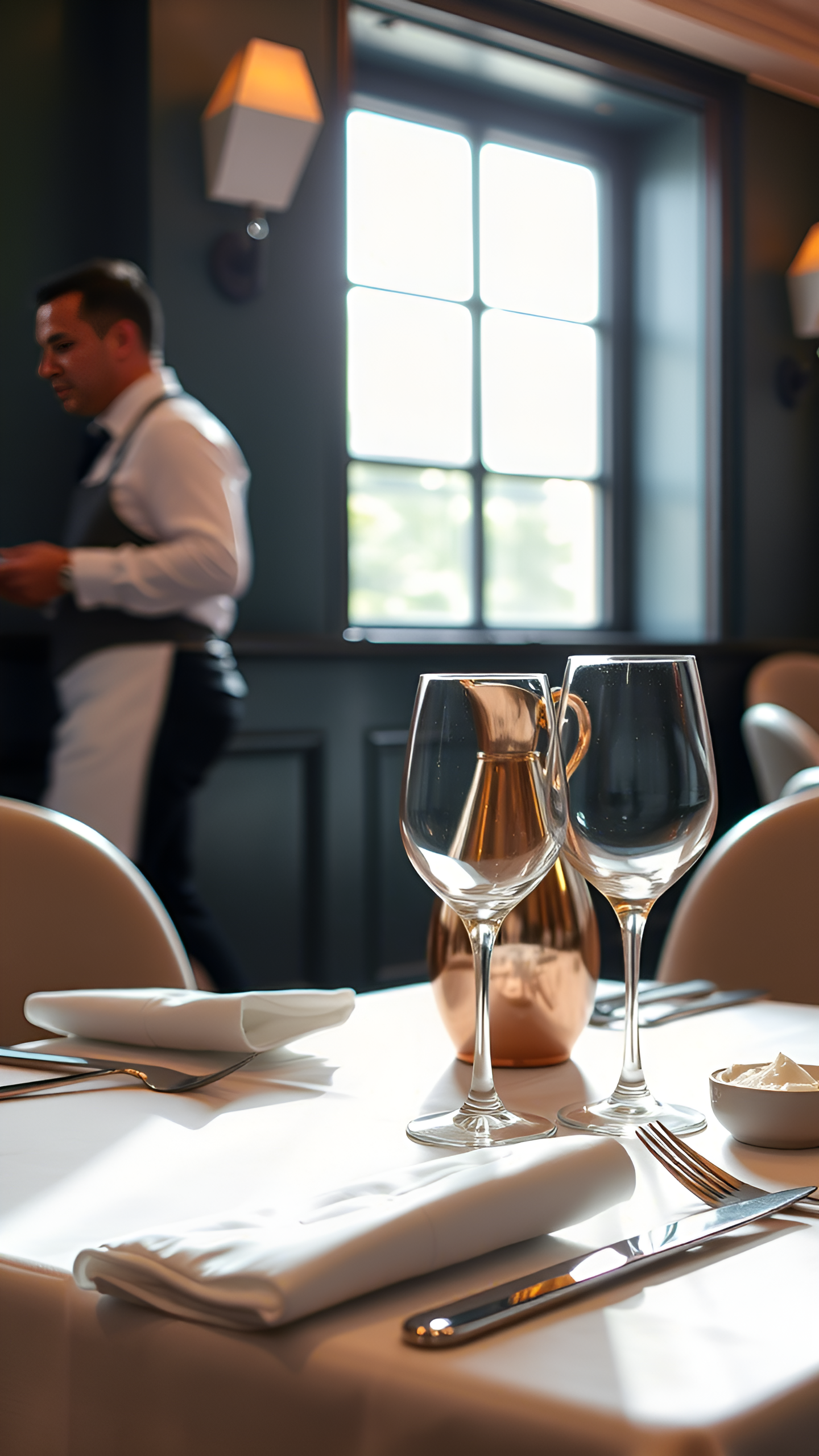 Indulge in the sophistication of fine dining with this elegant table setting featuring crystal wine glasses and polished cutlery. The warm ambiance and soft lighting create an inviting atmosphere, perfect for a memorable culinary experience.