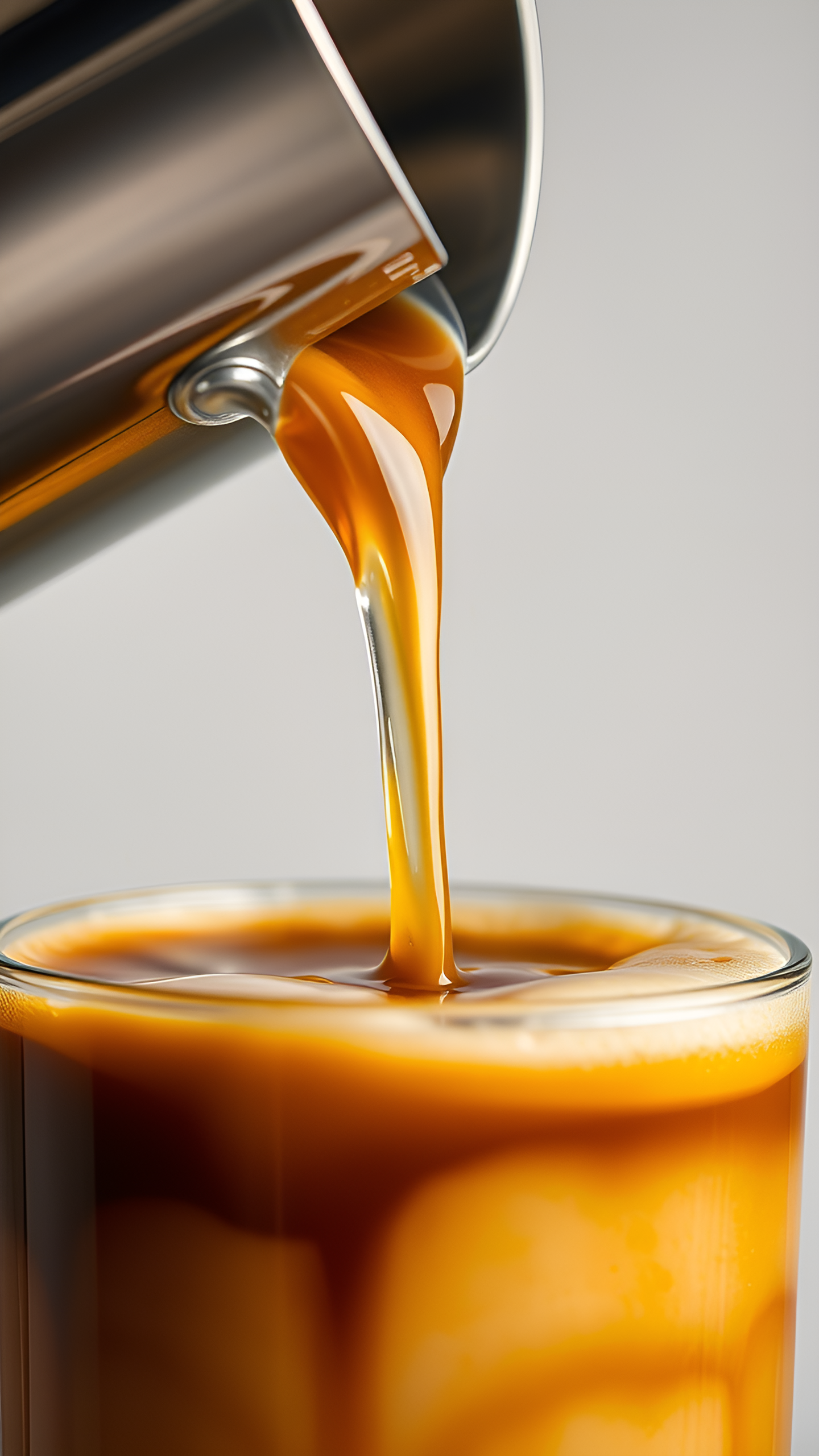 Indulge in the rich, creamy texture of this close-up wallpaper showcasing a perfectly poured coffee drink. The smooth caramel hues blend beautifully as the liquid cascades into the glass, creating an inviting and warm atmosphere. Ideal for coffee lovers and those who appreciate the art of beverage photography.