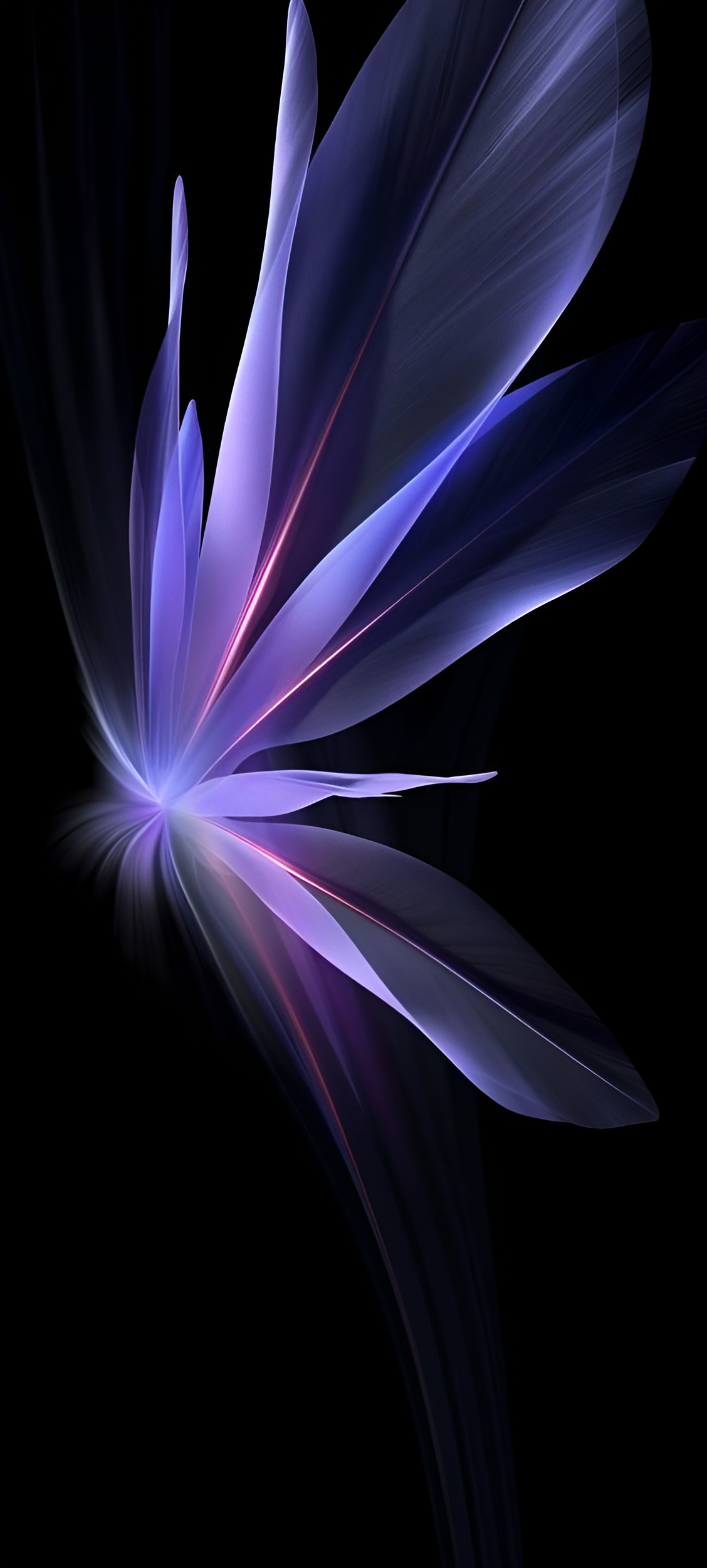 Introducing 'Luminous Wings: A Dance of Light,' a mesmerizing wallpaper that captures the ethereal beauty of flowing forms in shades of purple and blue. This abstract artwork features delicate, feather-like shapes that seem to float gracefully against a deep black backdrop, creating a sense of movement and tranquility. The interplay of light and shadow enhances the depth and dimension of the design, making it a perfect choice for those who seek inspiration and elegance in their digital spaces.