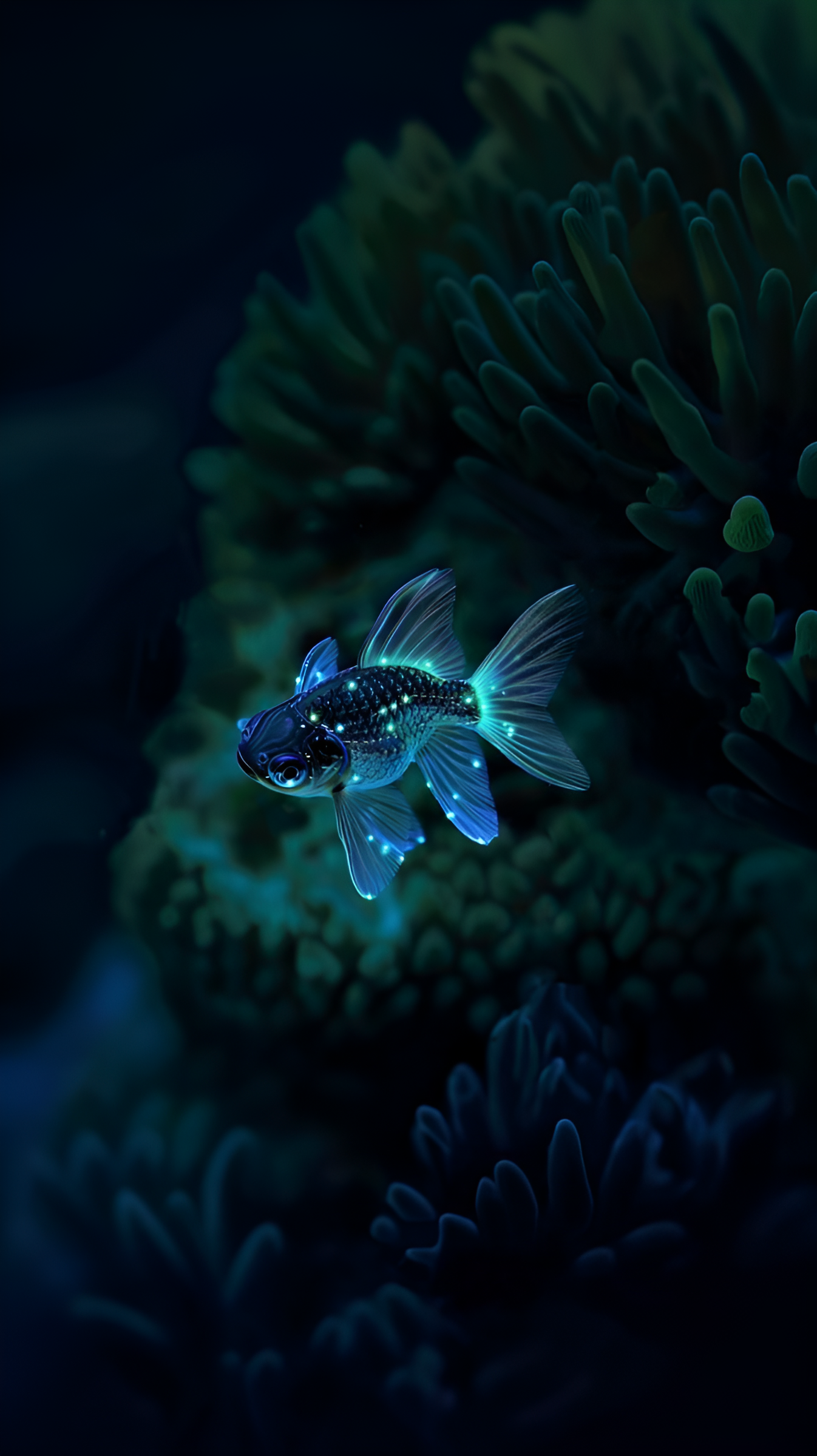 Introducing 'Ethereal Depths: The Glowing Guardian,' a stunning wallpaper that immerses you in the serene beauty of the underwater world. This artwork features a luminescent fish gracefully swimming amidst soft coral formations, illuminated by an enchanting glow. The dark, moody background enhances the ethereal quality of the scene, creating a sense of tranquility and wonder. Ideal for nature enthusiasts and those who appreciate the mysteries of the ocean, this wallpaper invites you to explore the depths of aquatic beauty.