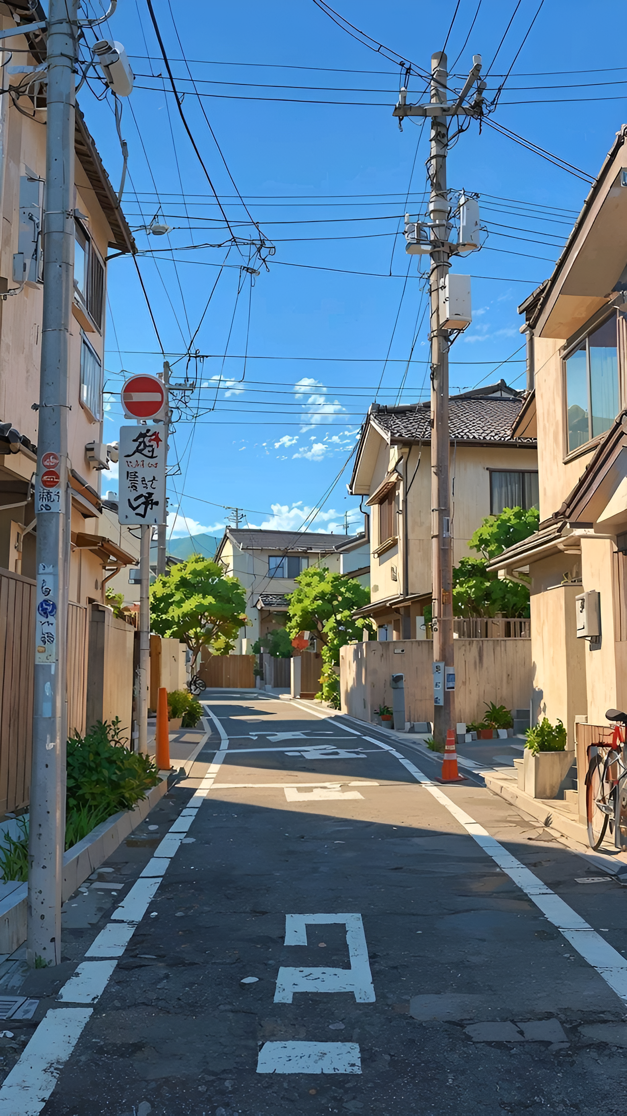 Introducing 'Quiet Pathways: A Glimpse of Everyday Life,' a serene wallpaper that captures the tranquil beauty of a traditional Japanese neighborhood. This artwork features a narrow street lined with quaint houses, lush greenery, and clear blue skies. The scene is framed by power lines and street signs, adding character to the urban landscape. The soft sunlight casts gentle shadows, creating a warm and inviting atmosphere that invites viewers to stroll through this peaceful setting. Perfect for those who appreciate the simplicity and charm of everyday life in a vibrant community.