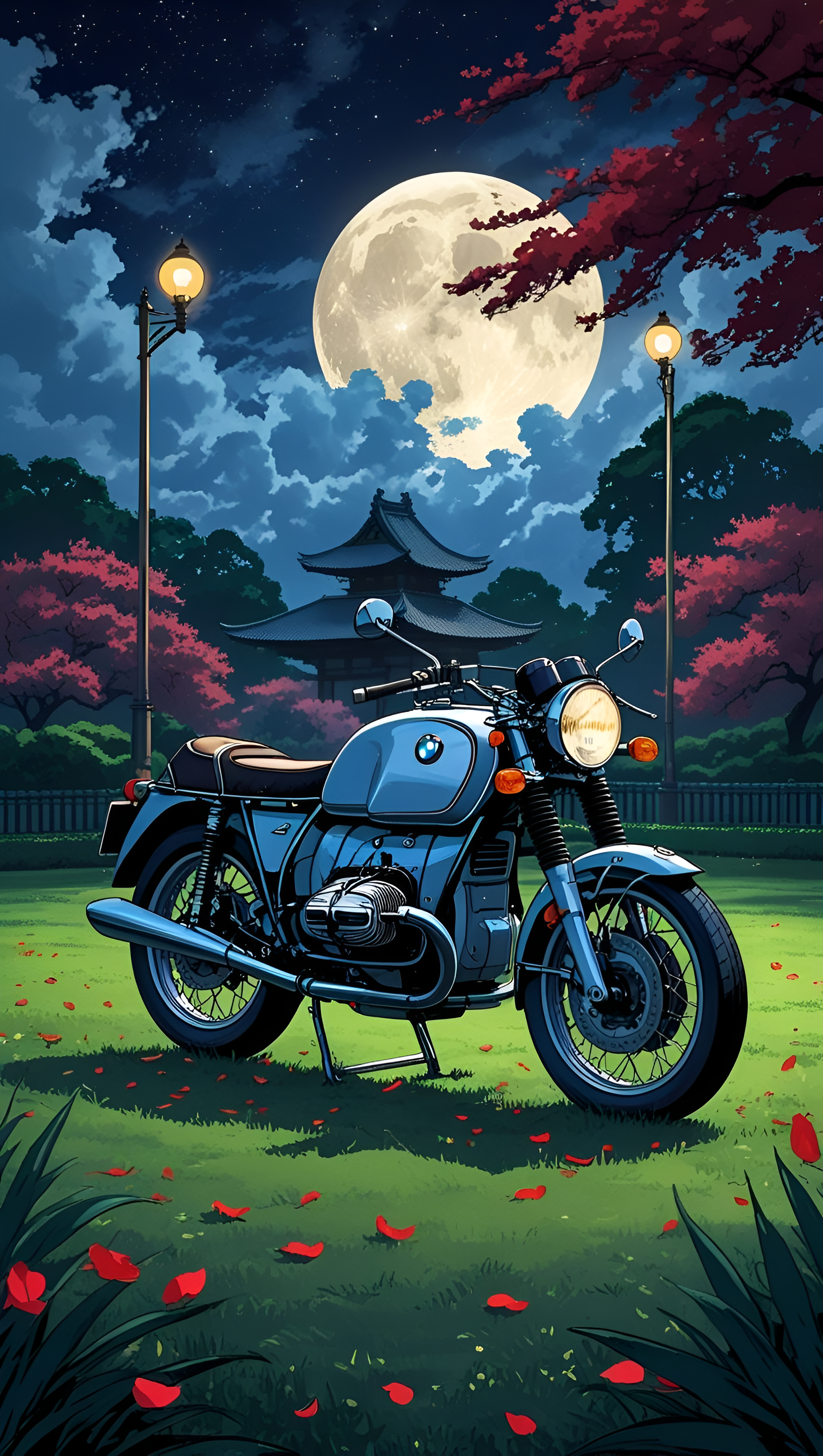 Presenting 'Moonlit Ride: The Classic BMW,' an enchanting wallpaper that captures the allure of a vintage motorcycle parked gracefully in a serene park setting. The scene is illuminated by a bright full moon, casting a soft glow over the classic BMW motorcycle, which stands out against the lush green grass and vibrant red petals scattered around. In the background, traditional architecture and cherry blossom trees add to the tranquil ambiance of the night. This artwork is perfect for motorcycle enthusiasts and lovers of nighttime landscapes, evoking a sense of adventure and nostalgia.