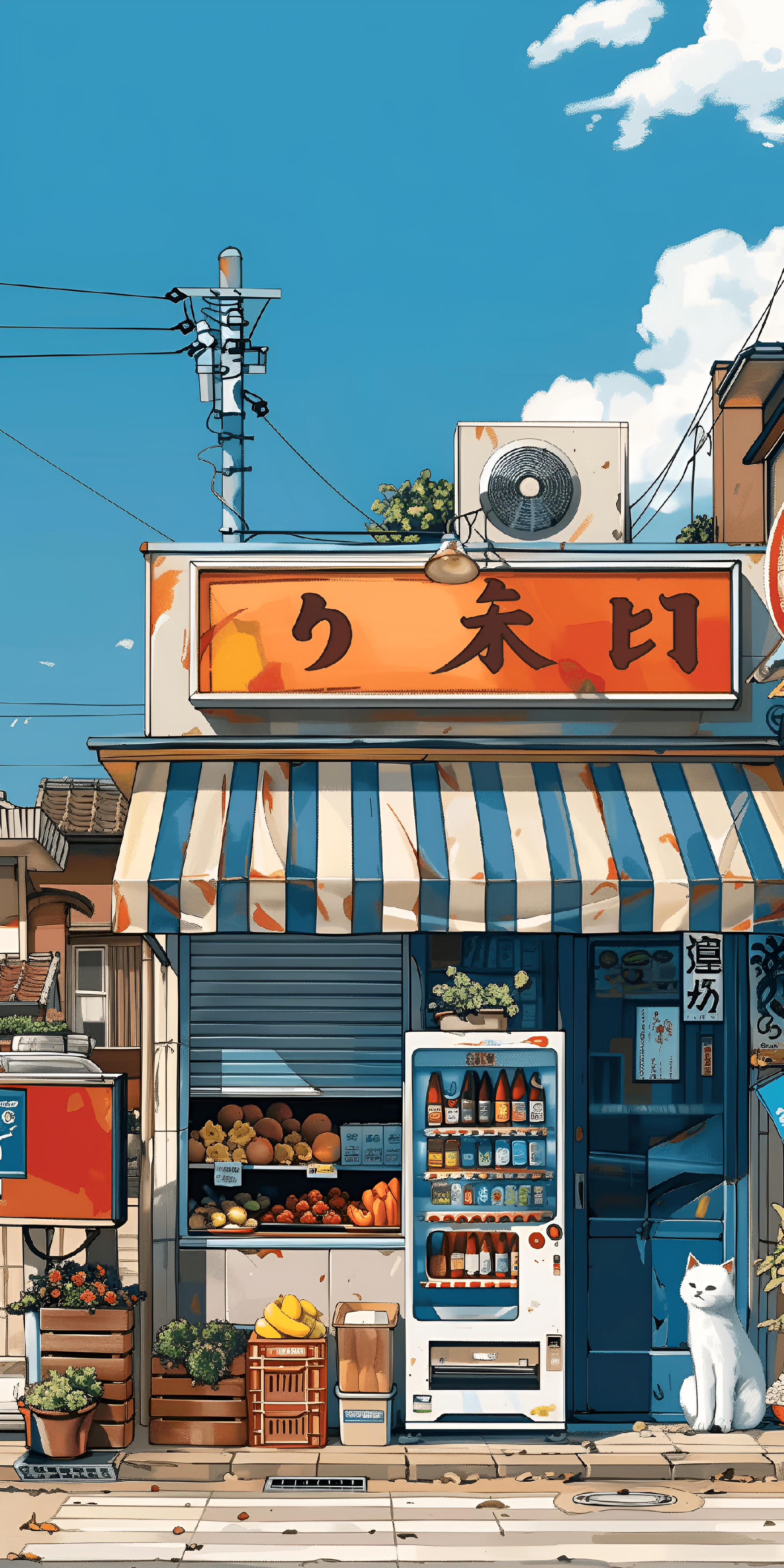 Introducing 'Charming Corner Store: A Day in the Neighborhood,' a delightful wallpaper that captures the essence of a quaint shop in a bustling neighborhood. The scene features a vibrant storefront adorned with a striped awning, showcasing a variety of fresh fruits and beverages in vending machines. A friendly white cat sits patiently at the entrance, adding a touch of warmth to the inviting atmosphere. The clear blue sky and fluffy clouds overhead create a serene backdrop, making this artwork perfect for those who appreciate the charm of everyday life and the beauty of community spaces.