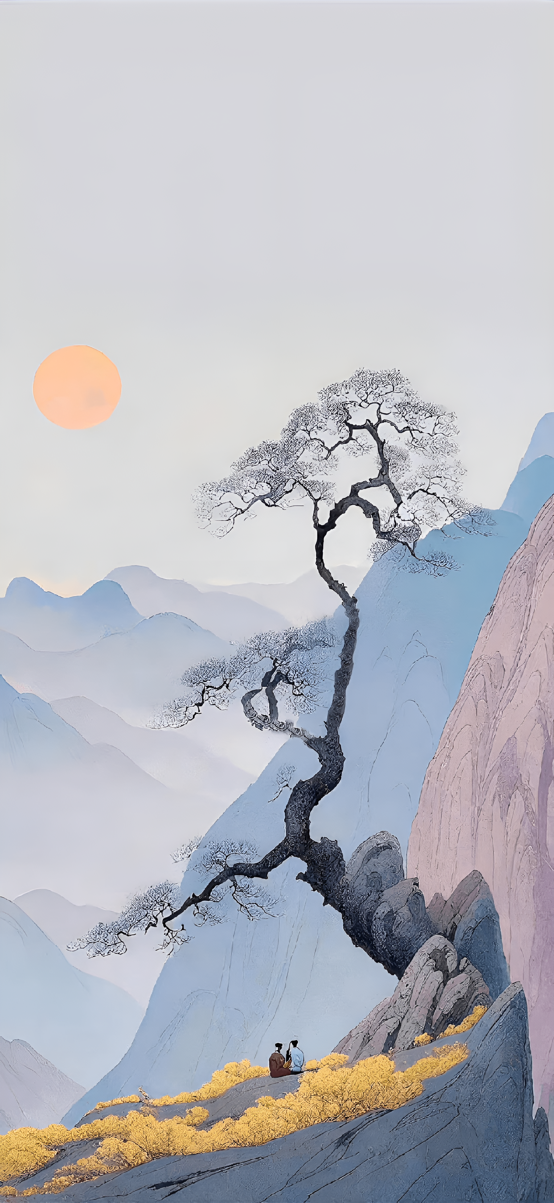 Introducing 'Whispers of Nature: A Mountain Retreat,' a breathtaking wallpaper that encapsulates the tranquility and beauty of a serene mountain landscape. The artwork features a solitary, elegantly twisted tree standing on a rocky ledge, overlooking gentle mountains bathed in soft hues of blue and gray. A warm orange sun hangs low in the sky, casting a gentle glow over the scene. In the foreground, two figures sit peacefully on the rocks, surrounded by vibrant yellow foliage, creating a sense of companionship and reflection. This piece is perfect for those who cherish the calmness of nature and the beauty of quiet moments.