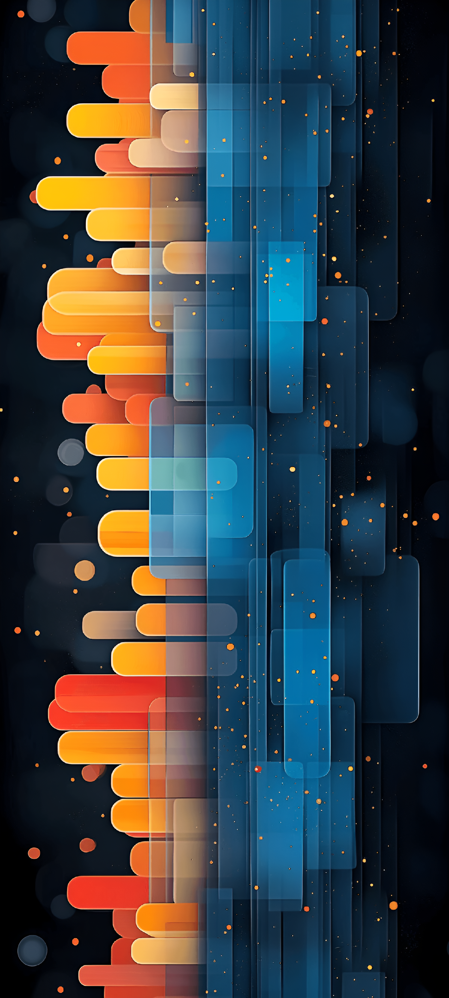 Introducing 'Digital Harmony: The Color Spectrum,' a mesmerizing wallpaper that captures the essence of modern digital design. This artwork features a dynamic array of colorful bars and transparent rectangles, transitioning seamlessly from warm oranges and reds to cool blues and teals against a dark background. The interplay of shapes and colors creates a sense of movement and rhythm, inviting viewers into a world of abstract beauty. Perfect for tech enthusiasts and lovers of contemporary art, this wallpaper adds a vibrant touch to any digital space.