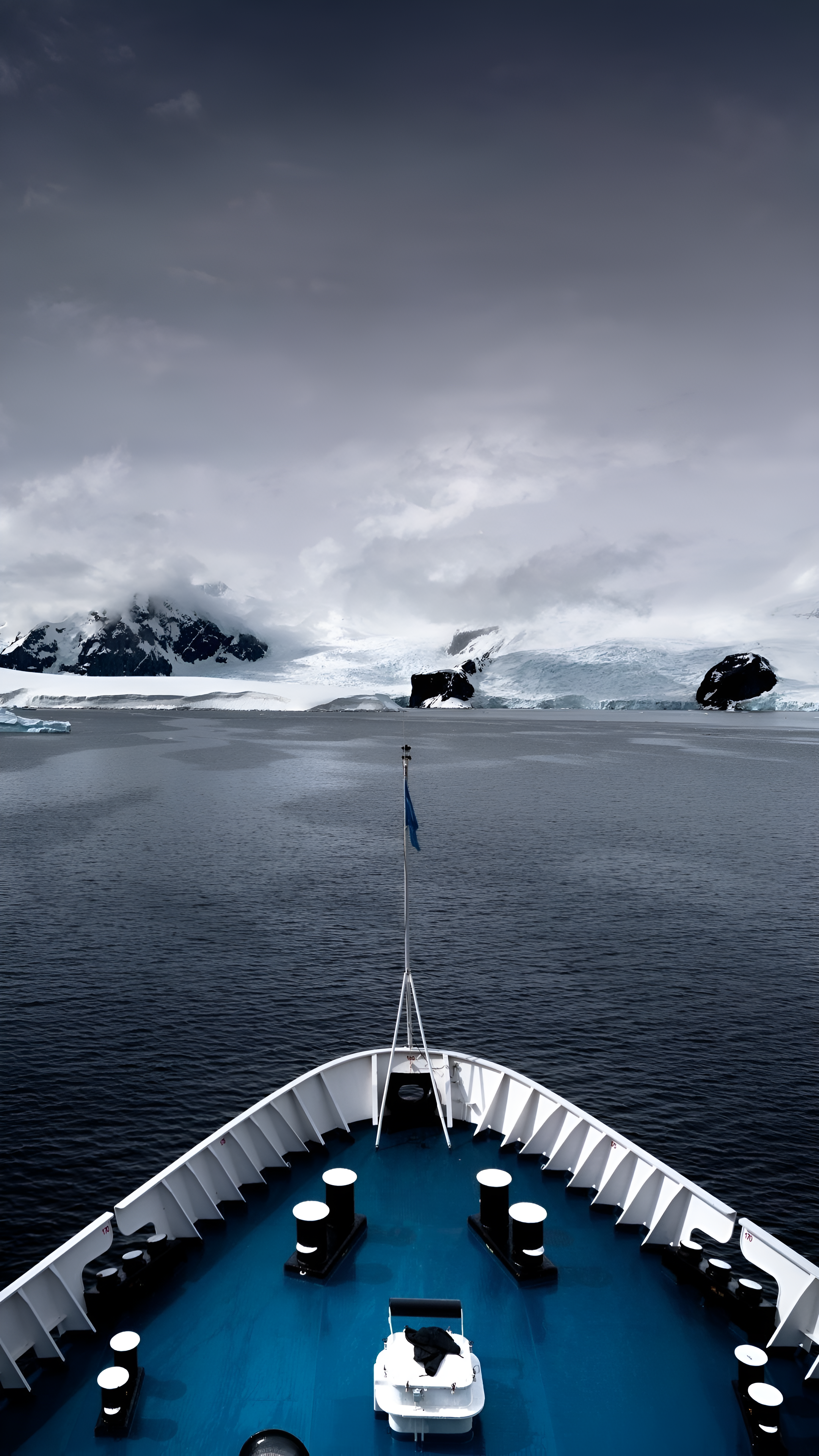 Embark on a breathtaking journey with this stunning wallpaper, showcasing a ship navigating through tranquil icy waters and dramatic mountain scenery. Perfect for adventure seekers and nature lovers.