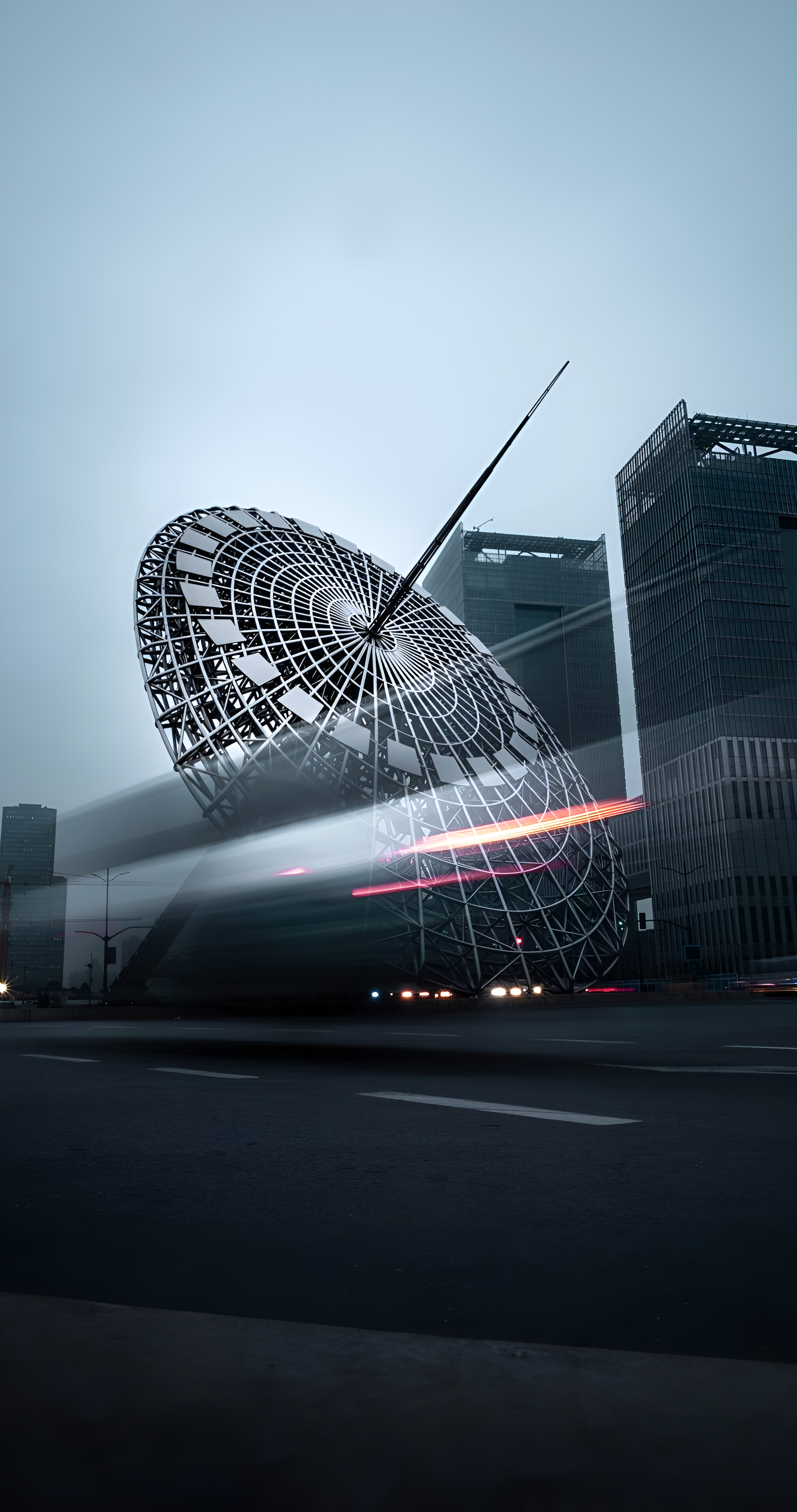 Explore the striking beauty of modern architecture with this captivating wallpaper featuring a unique spire structure set against a moody urban backdrop. The dynamic motion blur of passing vehicles adds a sense of life and energy to the scene, making it perfect for lovers of contemporary design and cityscapes.